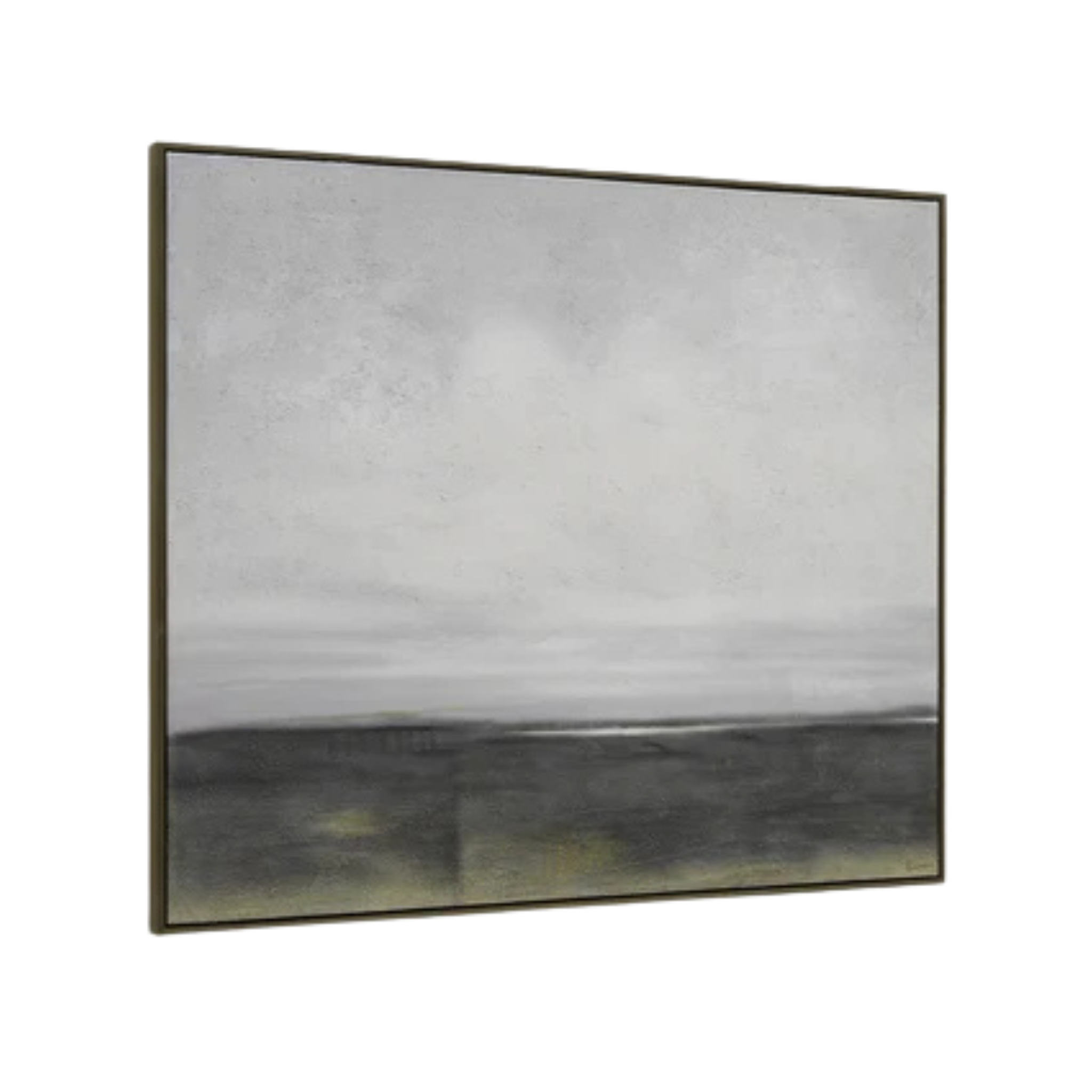 Introduce a calm, artful mood to any room with the Covez landscape canvas. Soft, hand-painted layers flow across the piece, enriched by delicate texture and touches of gold leaf that lend subtle dimension and shine. Set within a sleek black oak frame, this artwork blends modern elegance with organic warmth, making it a standout element in transitional interiors