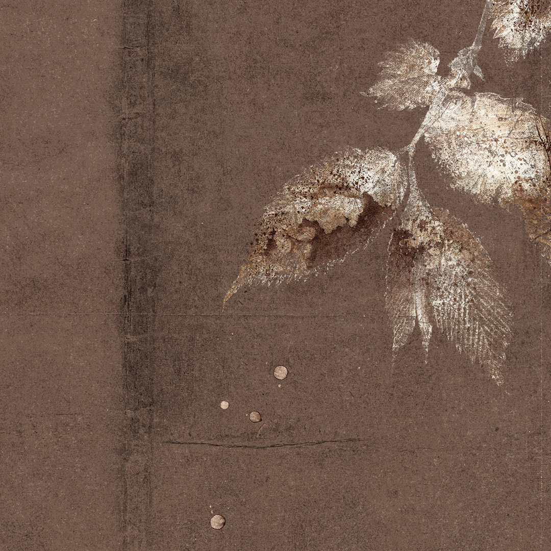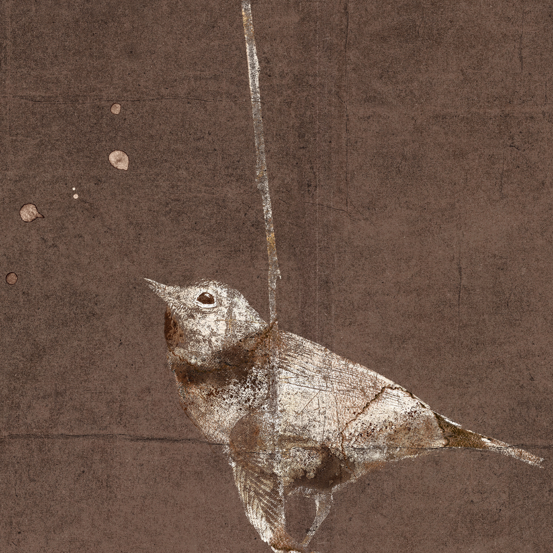 The delicate lines and use of negative space in this print highlight the ephemeral nature of the moment captured within. Thin lines of white and cream outline the shapes of birds and foliage in a variety of settings, standing out against varying shades of brown, creased paper backgrounds.