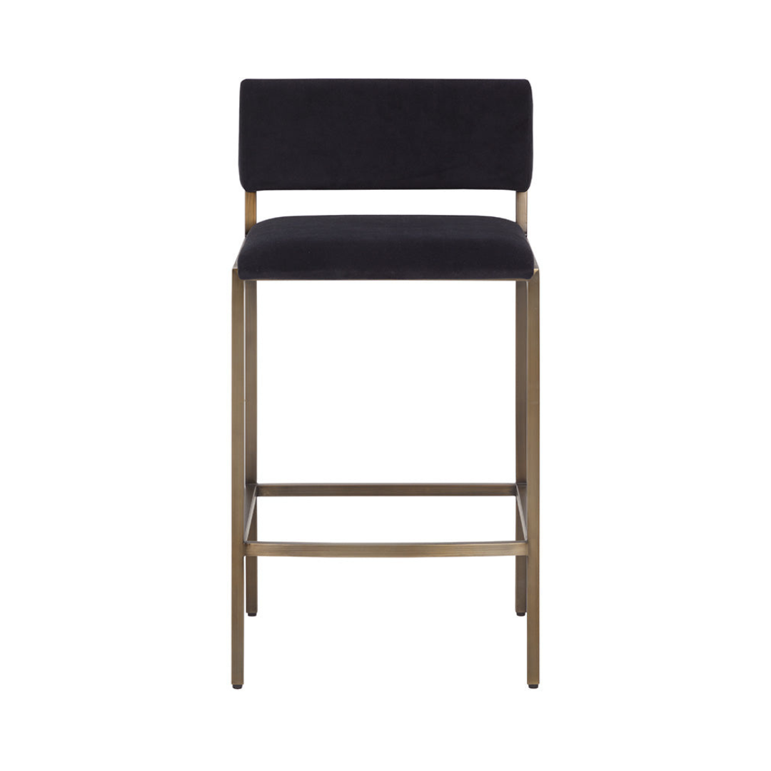 The Mina Counter Stool features a gently extended seat and foam-padded back for comfortable, everyday seating. Upholstered in smooth Abbington Black fabric (with a subtle navy undertone), it’s paired with a gold powder-coated steel frame wrapped in nappa black faux leather and finished with eyelet and rope detailing for a refined touch.