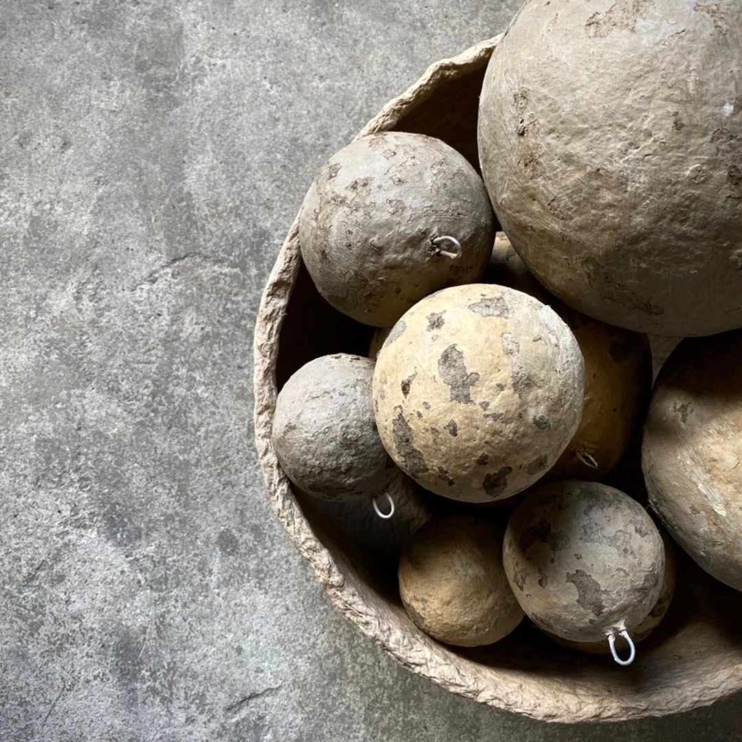 Handcrafted from recycled paper scraps and fenugreek seeds, these mocha-toned papier-mâché balls bring natural texture and warmth to your holiday décor. Perfect for hanging on the tree or displaying in a decorative bowl.