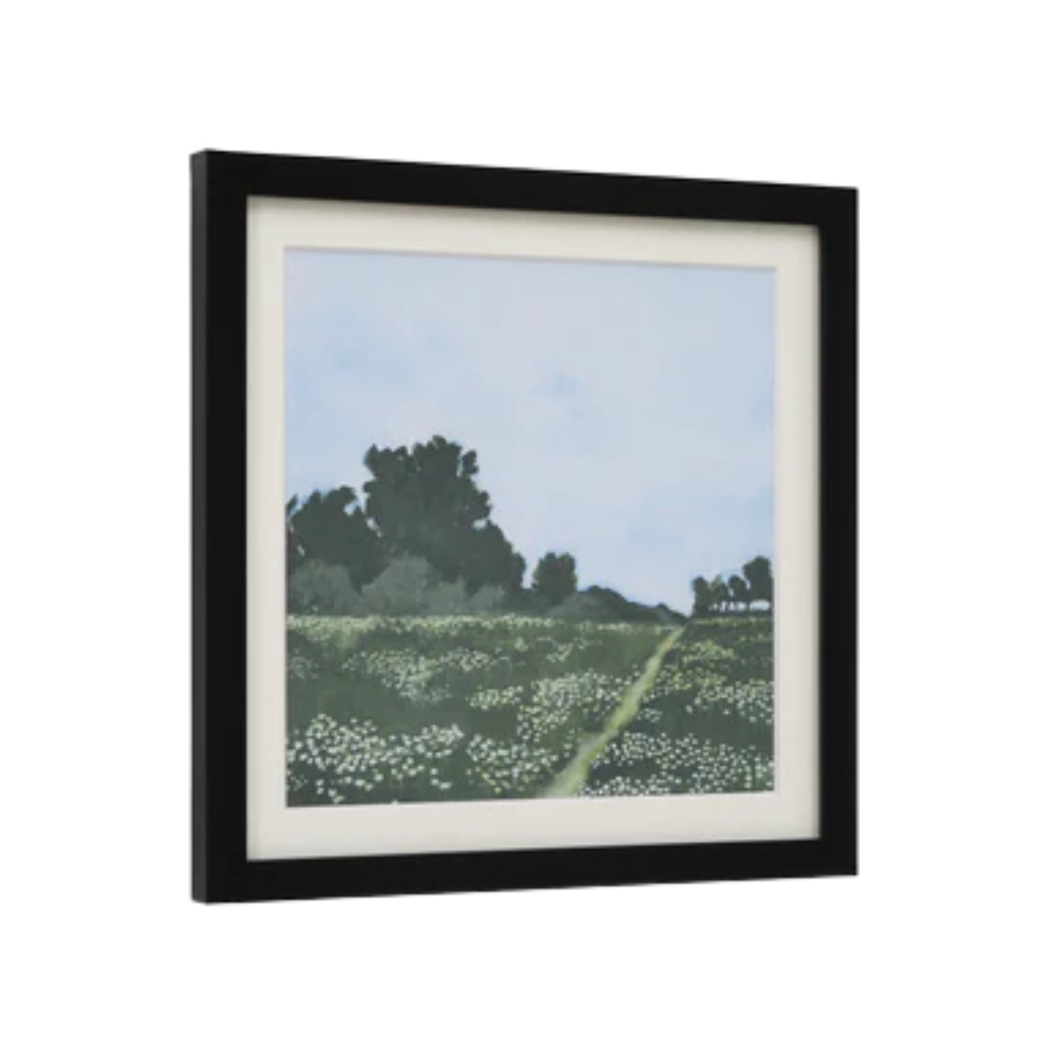 The Olano bookshelf art showcases a tranquil landscape in soft, harmonious hues. Set under glass with a beveled matboard, its compact size makes it ideal for shelves or side tables, adding a subtle, elegant accent that transforms any corner into a peaceful, thoughtfully styled vignette.
