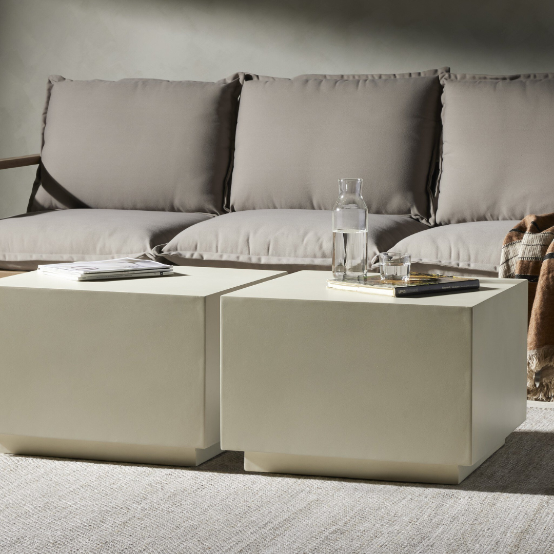 Industrial materials in smoothly refined shapes. Concrete forms a cubed coffee, side or bunching table. This piece is designed in collaboration with a renowned Los Angeles furniture designer. This collaboration began in the early 2000s, producing several unique collections including reclaimed wood-driven case goods and Brazilian-inspired upholstery. Made for indoor or outdoor spaces. Cover or store indoors during inclement weather and when not in use.
