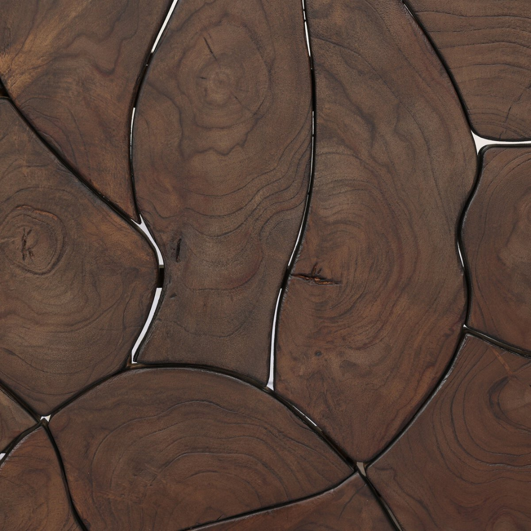 Panels of solid teak root are laminated to create a mosaic look against beautiful natural graining, shaped into a pedestal-style outdoor end table. Cover or store indoors during inclement weather and when not in use.