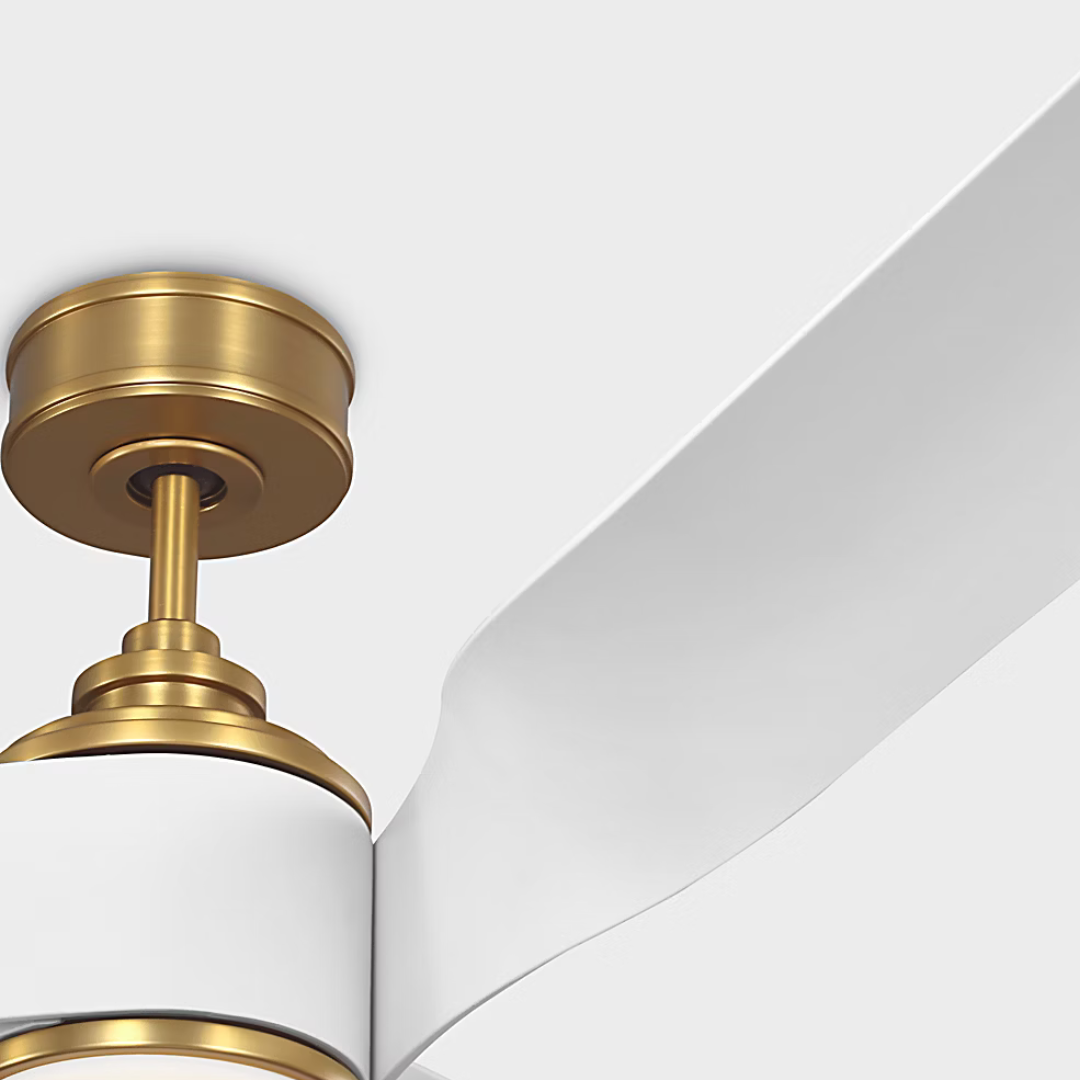 The Touro Smart 60" LED fan by Chapman & Myers is inspired by the elegant curved profile of a jet engine. Slim blades wrap around the cylindrical housing and then gently twist away to create a horizontal silhouette. This app-controlled illuminating fan is damp-rated for indoor and outdoor use alike.