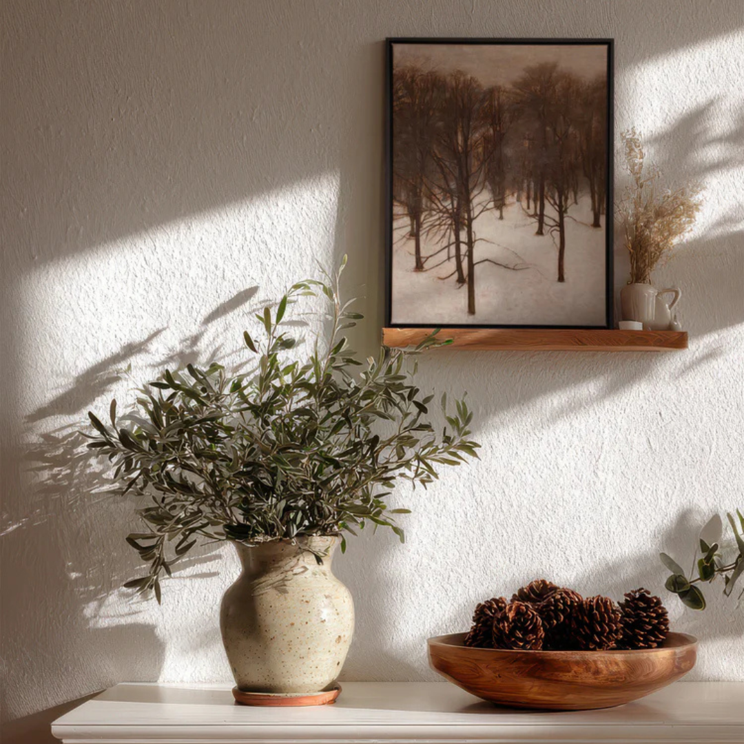This artwork depicts a forest frozen by the cold, where tree trunks vanish into a white mist. The brown and gray tones create a calm, almost silent atmosphere. The subtle abstraction of the forms lends an artistic and modern touch. Ideal for a space seeking the softness and depth of winter.