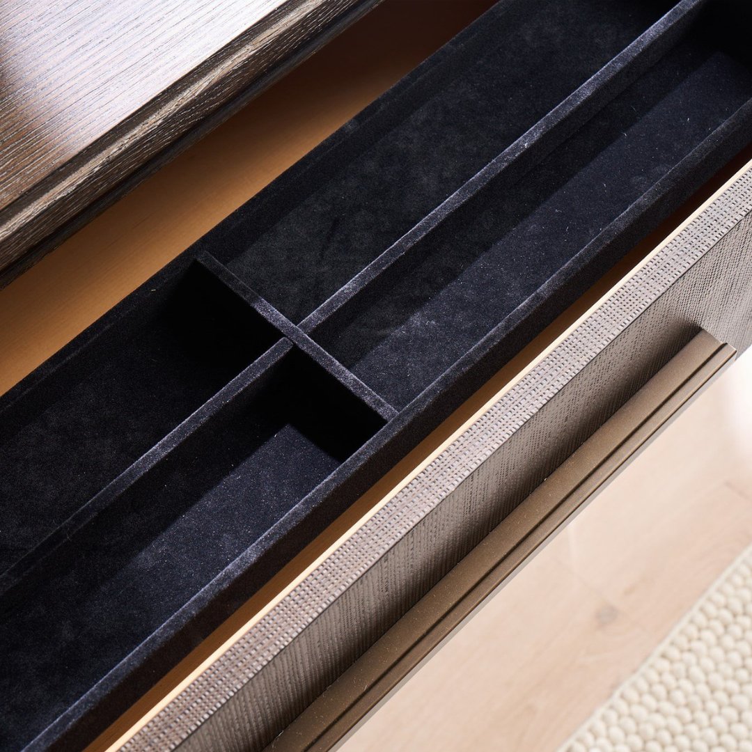 The Milo Dresser offers upscale storage with six spacious drawers in a rich Cocoa finish and embossed textured fronts. A sleek Smoked Gold metal base adds modern elegance, while thoughtful details—like felt-lined jewelry trays and cedar-lined bottoms—enhance everyday functionality.