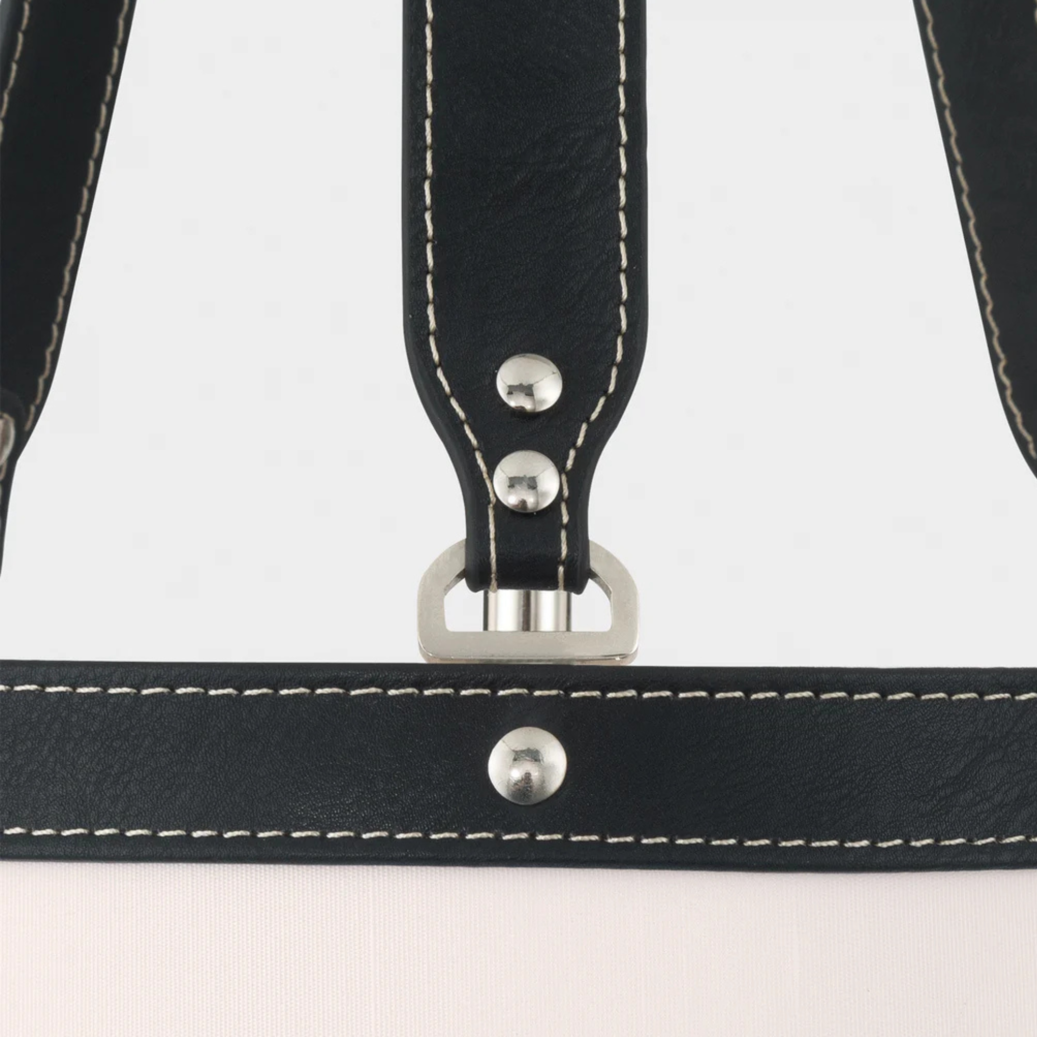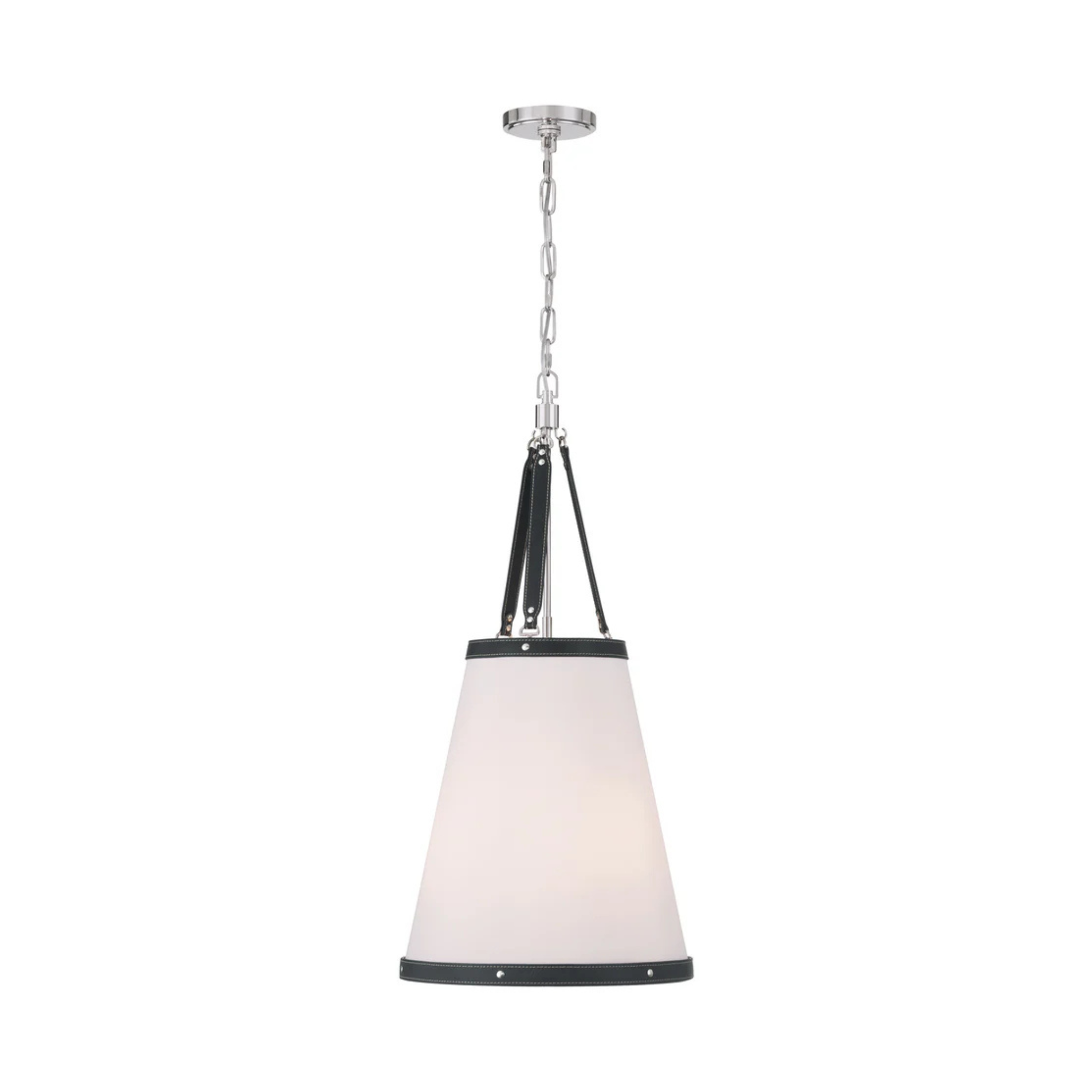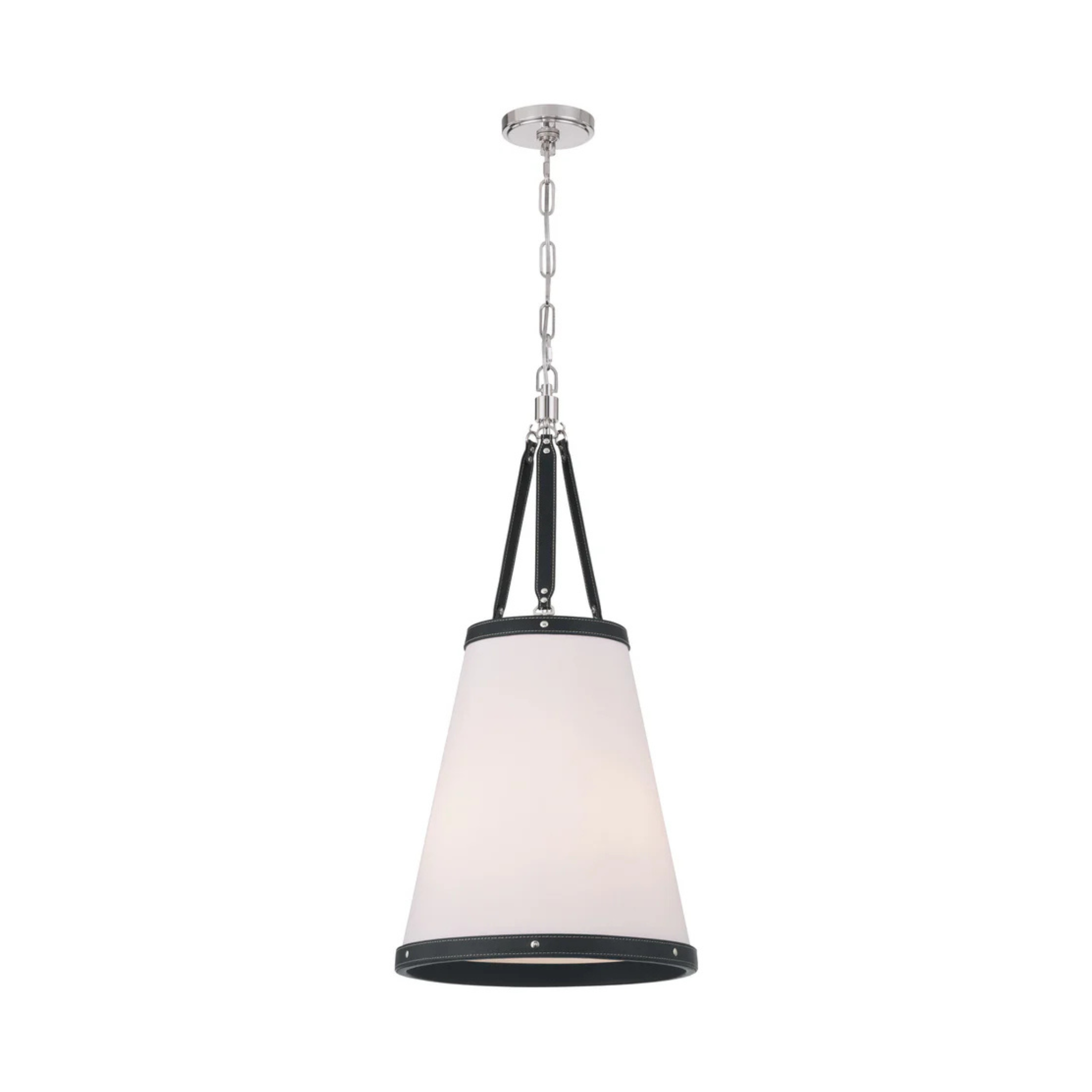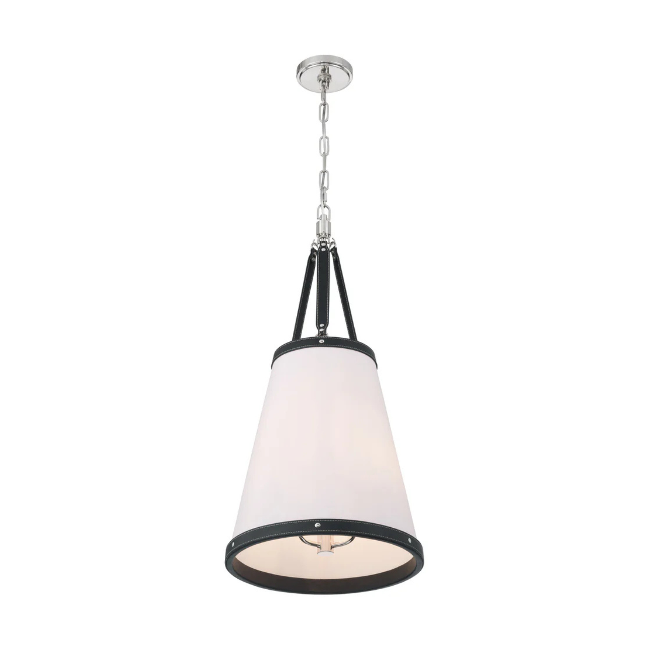 - Fabric shade with vegan leather trim.