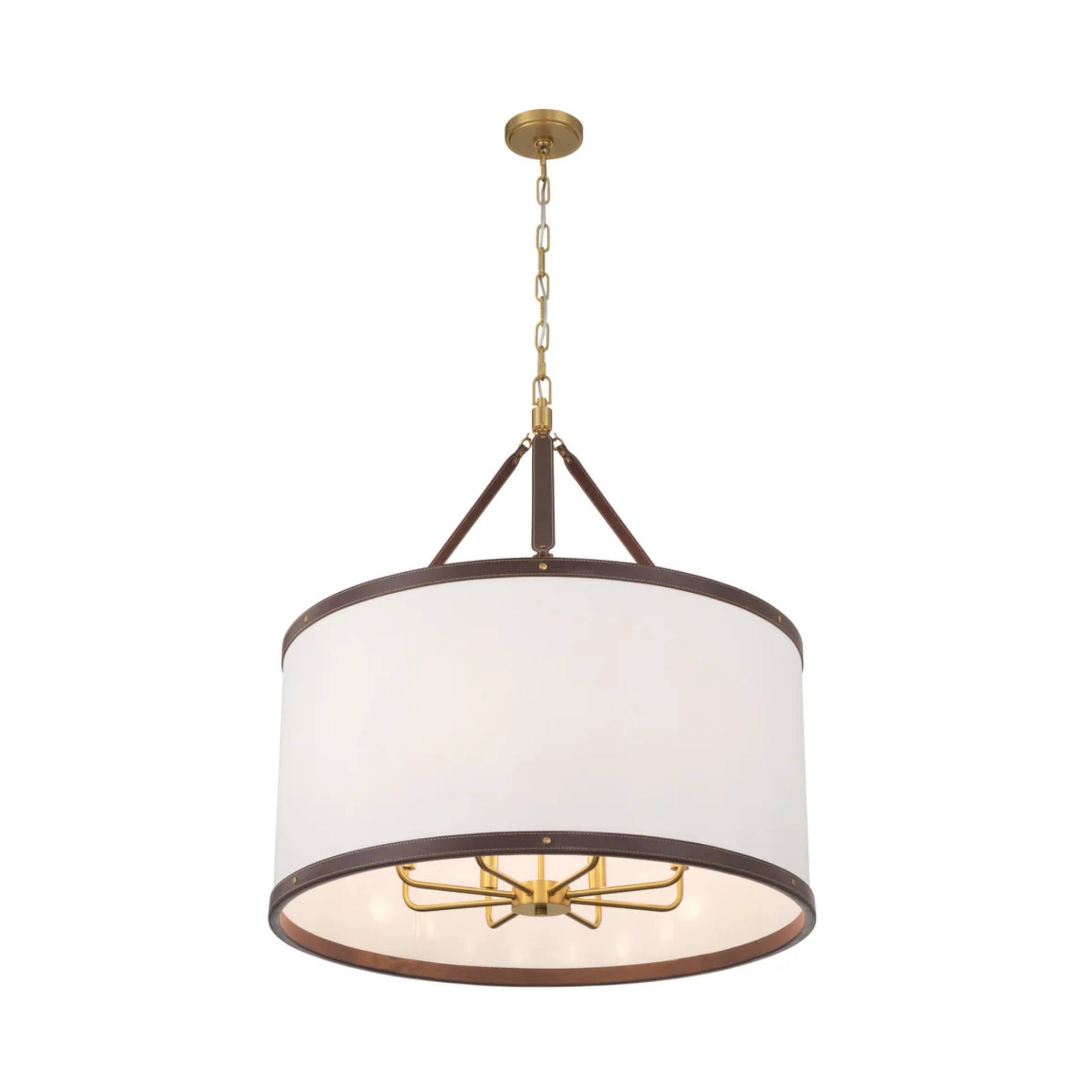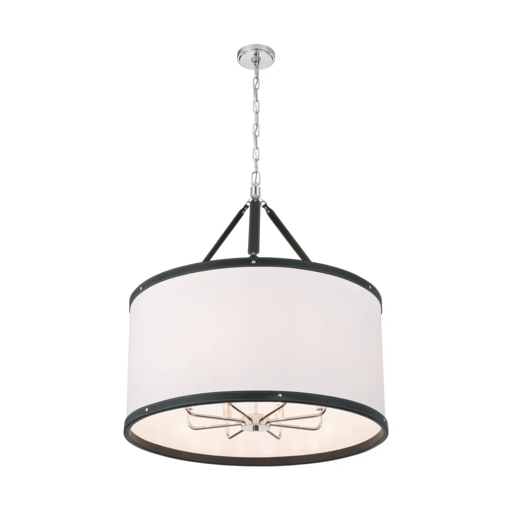 - Fabric shade with vegan leather trim.