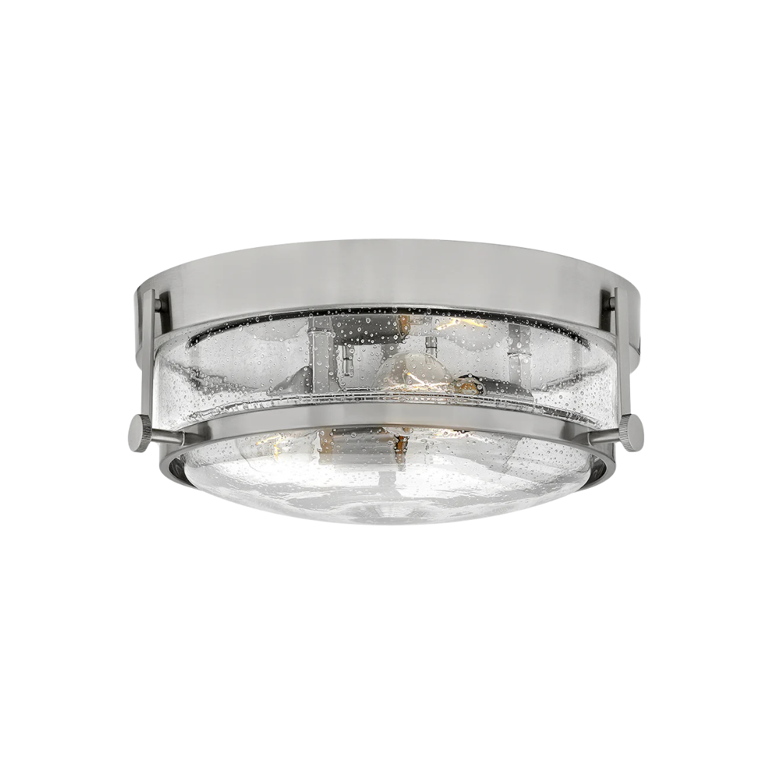 Harper’s sleek, retro design elevates the traditional ceiling mount with a unique clear seedy glass bound by a prominent metal ring and decorative knobs. Available in five classic finishes.