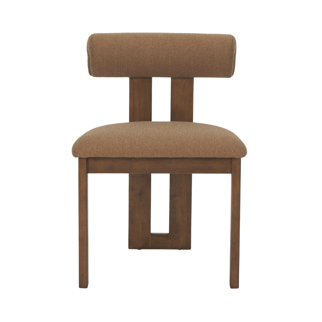 This dining chair blends graceful curves with bold architectural form, showcasing a rolled back, sculptural tripod base, and distinctive double-beam detailing.