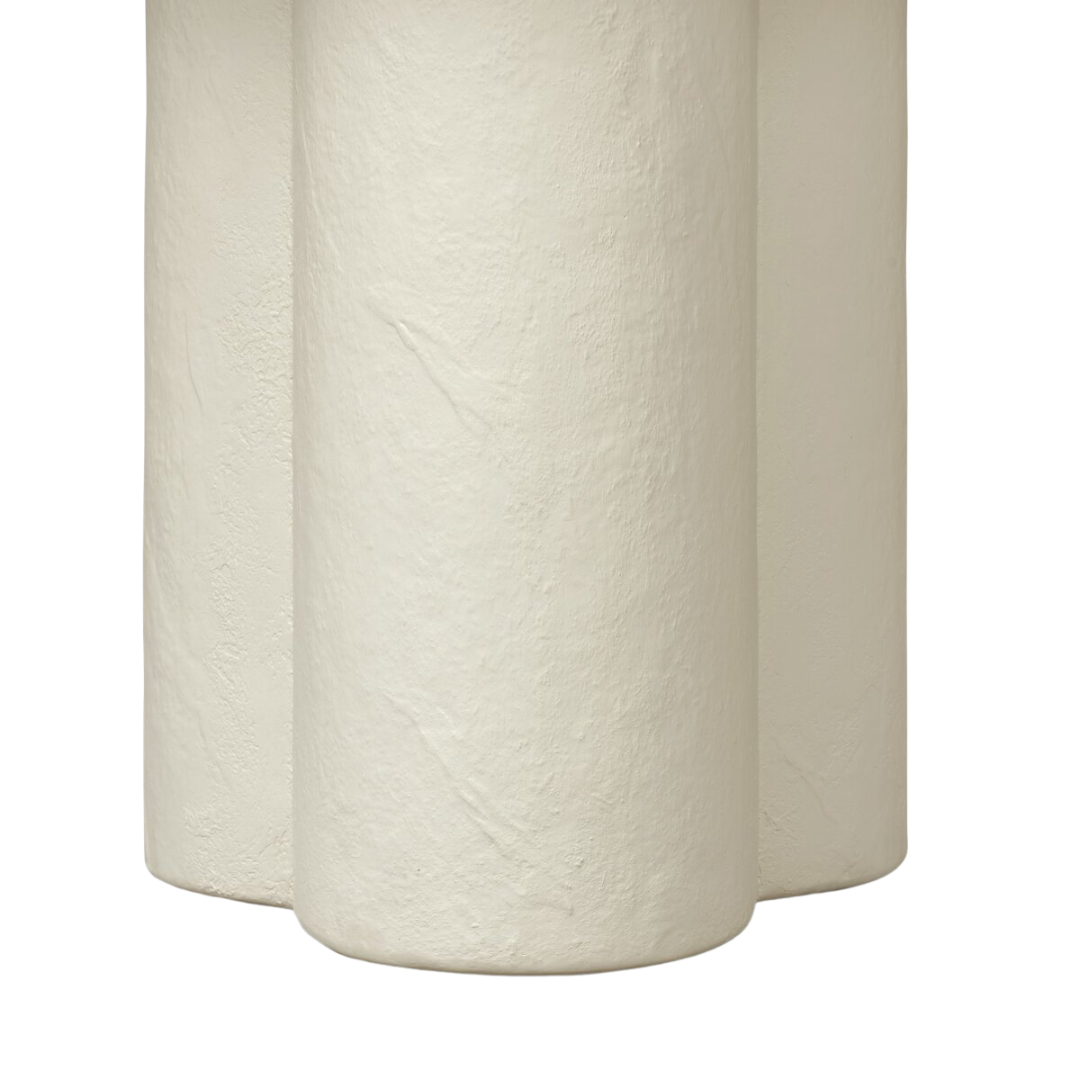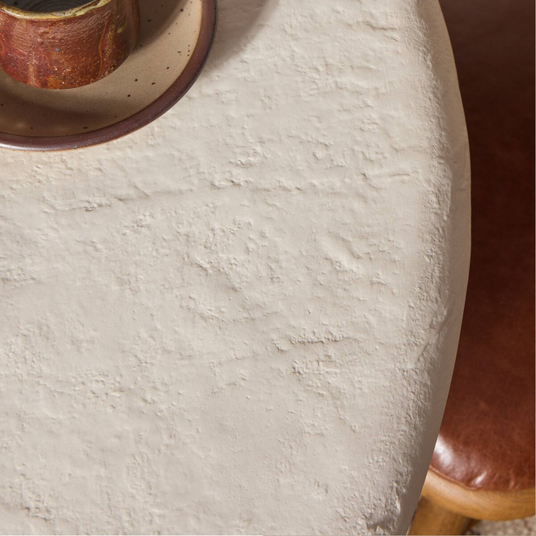Adobe vibes. Made from white-finished concrete, a clover-shaped base supports a thick-rounded tabletop. Soft yet textured look pairs alongside a wide range of furniture, from natural woods to leather and more.