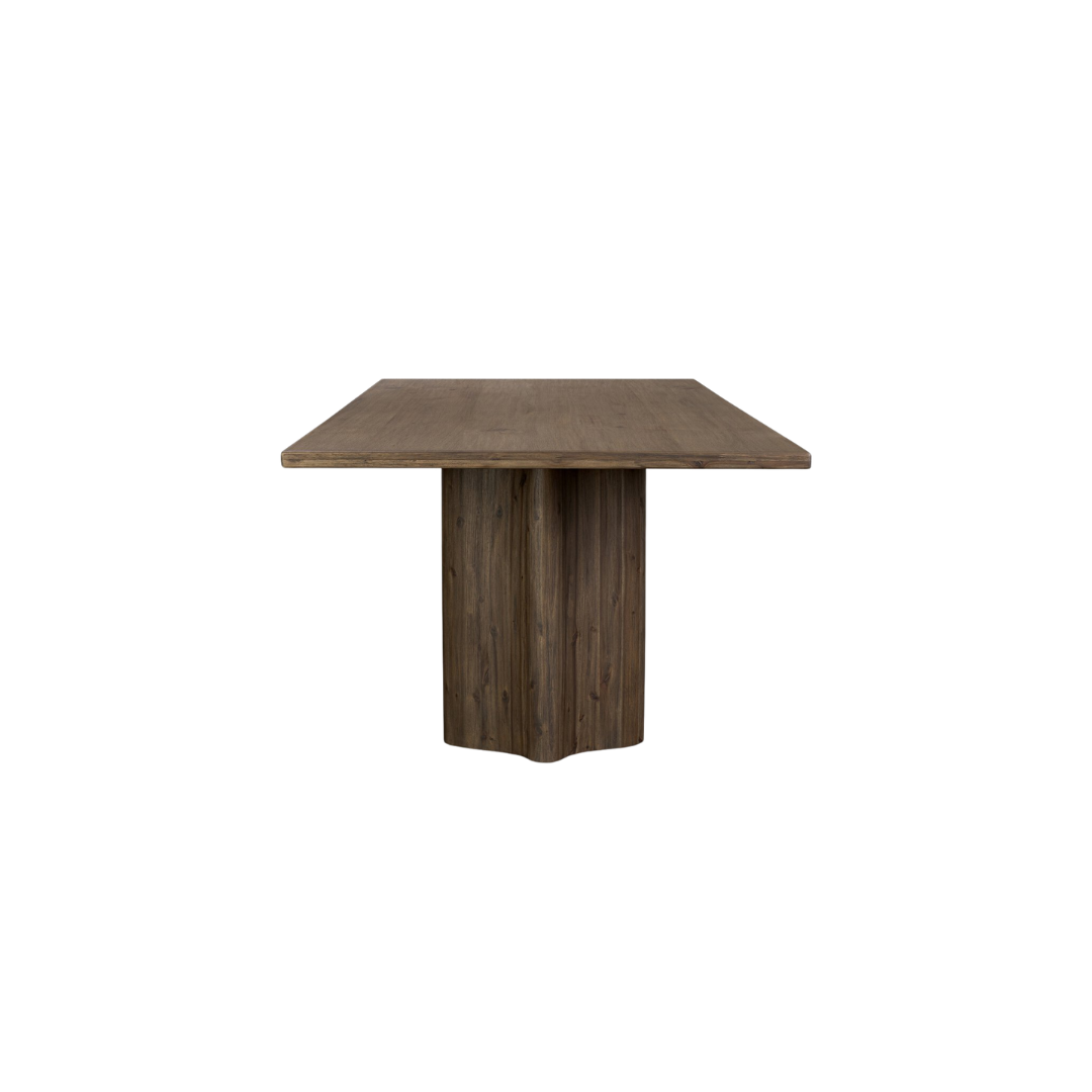 Spotlight on this beautifully sculpted dining table. Crafted from brown-finished weathered acacia, a long, rectangular profile is elevated with design-forward details like mirrored contoured base pedestals and a modernized trefoil arch profile.