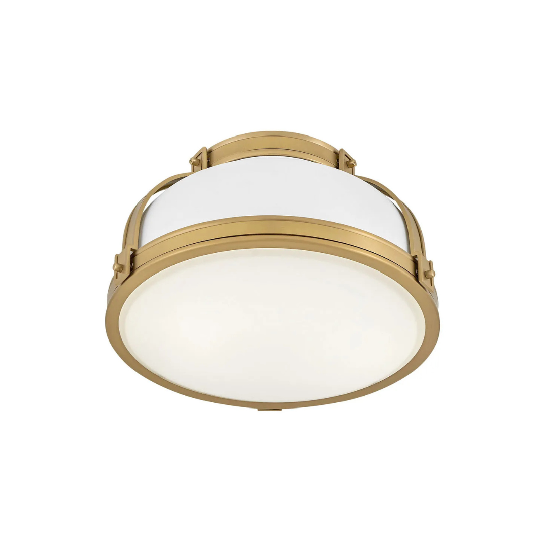 Timeless with a classic equestrian aesthetic, Barton’s metal dome shade with double-strap design is available in Black, Matte White, or Gloss White with Vivid Navy finishes complemented by Lacquered Brass and an Etched Opal glass diffuser.