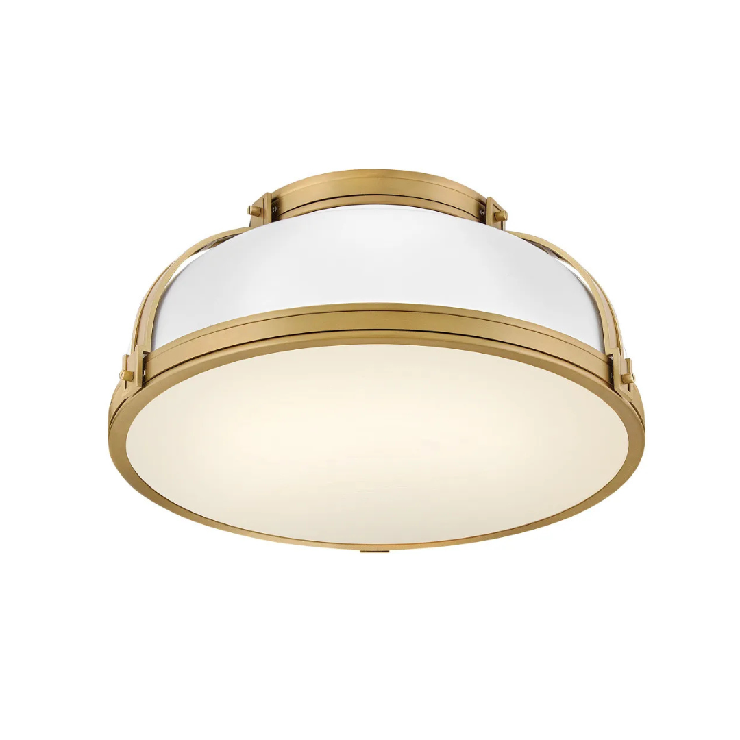 Timeless with a classic equestrian aesthetic, Barton’s metal dome shade with double-strap design is available in Black, Matte White, or Gloss White with Vivid Navy finishes complemented by Lacquered Brass and an Etched Opal glass diffuser.
