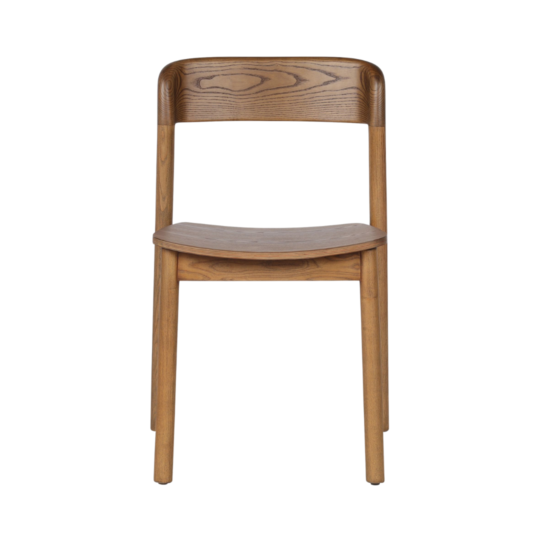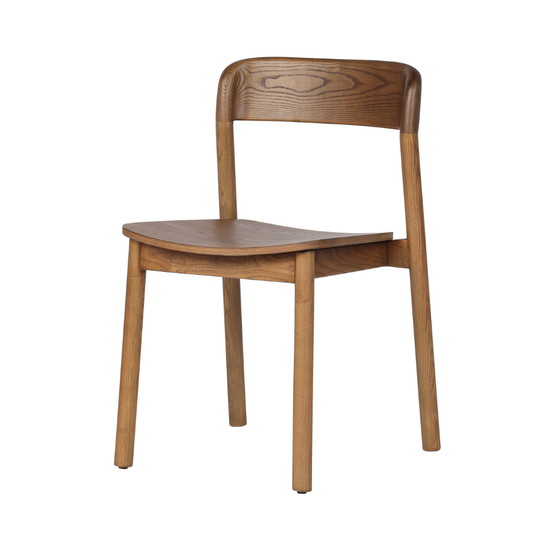 Sturdy solid wood chairs with mid-century modern styling. Rich finishing on the ash veneer is an easy match for various décor styles. Comfortable curved back creates a trendy look and provides support. Stackable design makes it easy to store away extra pieces when not in use. These commercial-grade chairs are suitable for residential or commercial use. Price is for a set of four chairs.