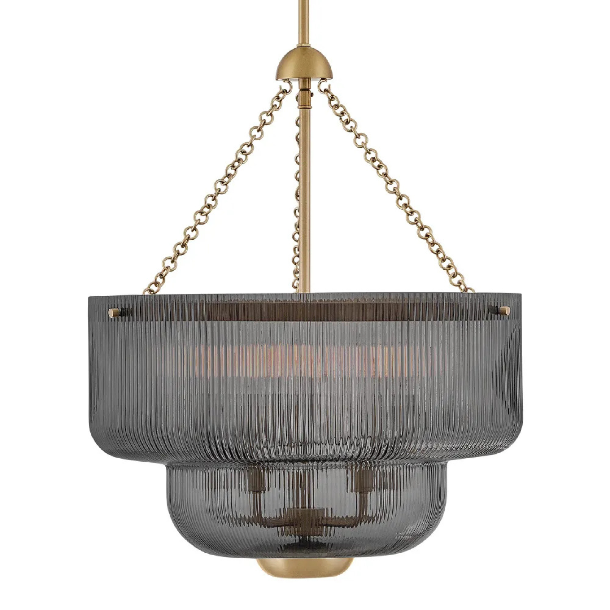 A clean design with traditional styling, Adella’s fine-ribbed glass shade creates a soft silhouette accented by fine details, delicate chains, and a sleek flared canopy. A Lacquered Brass finish complements Etched Opal or Smoke glass, accenting your living space with a distinguished aesthetic