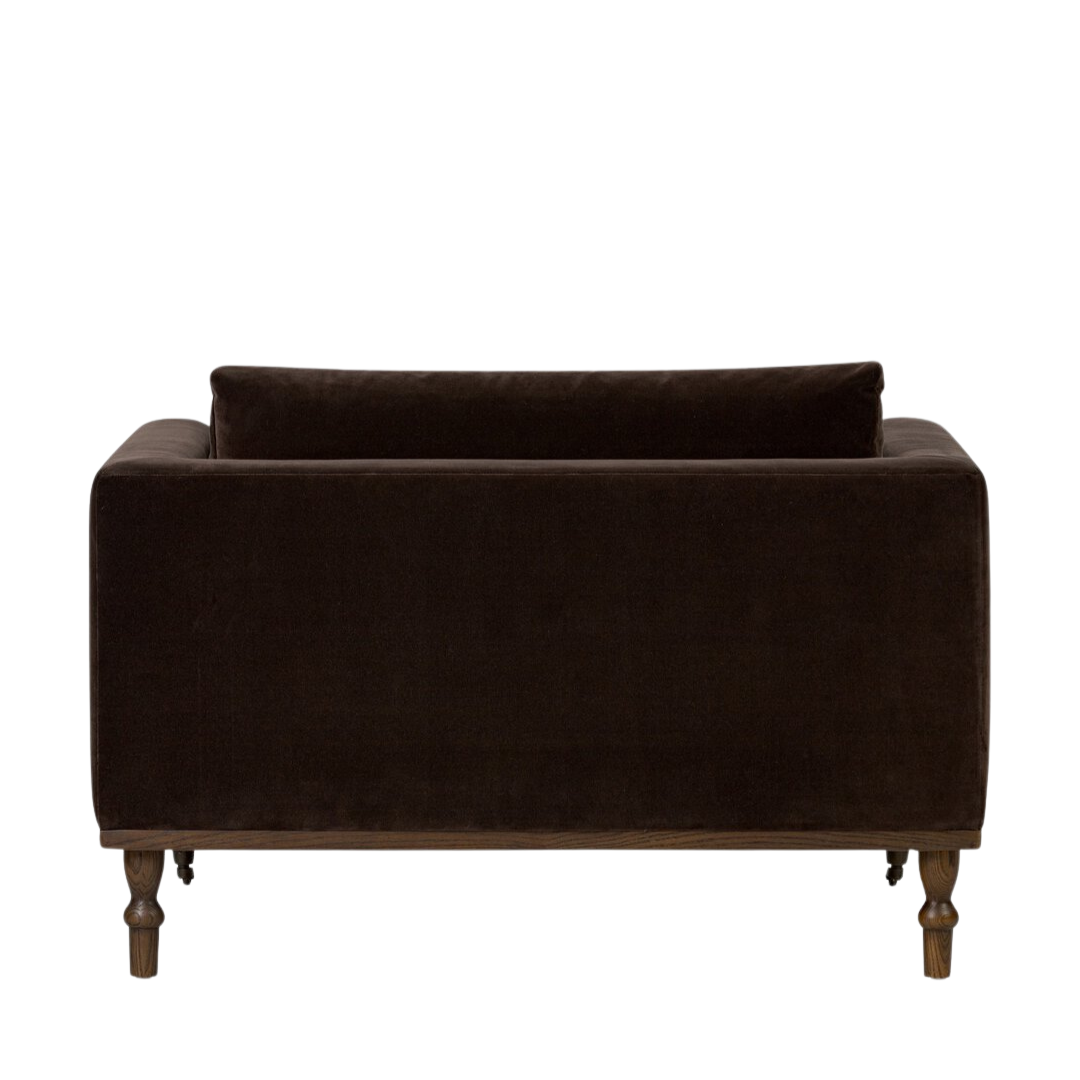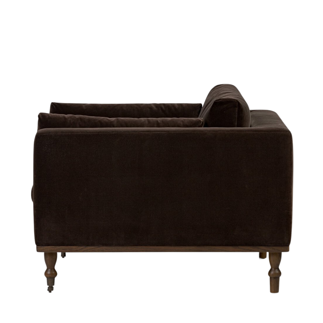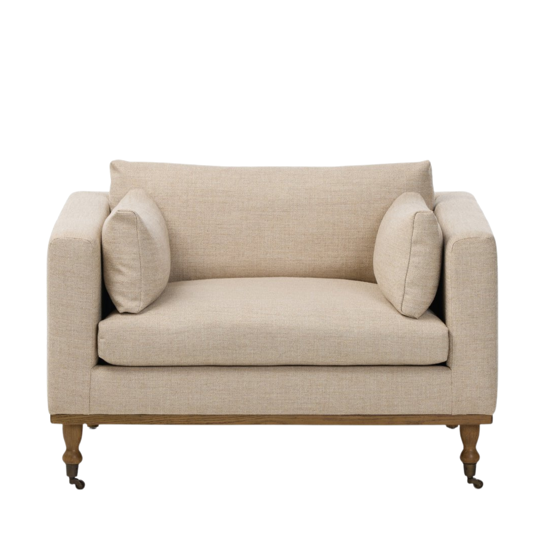 Mid-century modern with a dash of vintage detail. With traditional details like turned oak legs and brass casters, this low-profile accent chair features an elongated bench seat for an inviting sit.