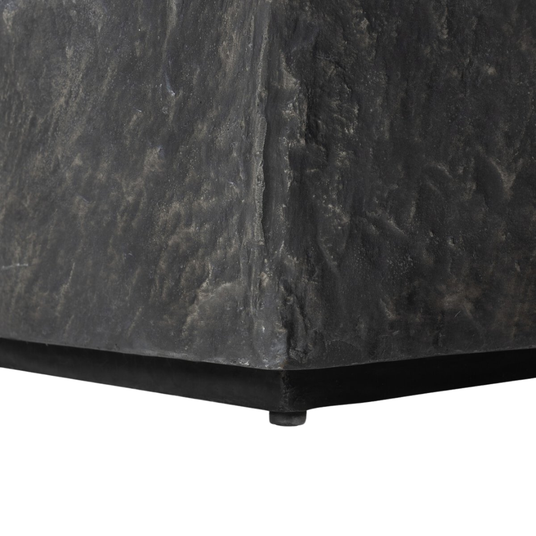 Cast black concrete features heavily textured sides that resemble natural slate, paired with a smoothed tabletop.
