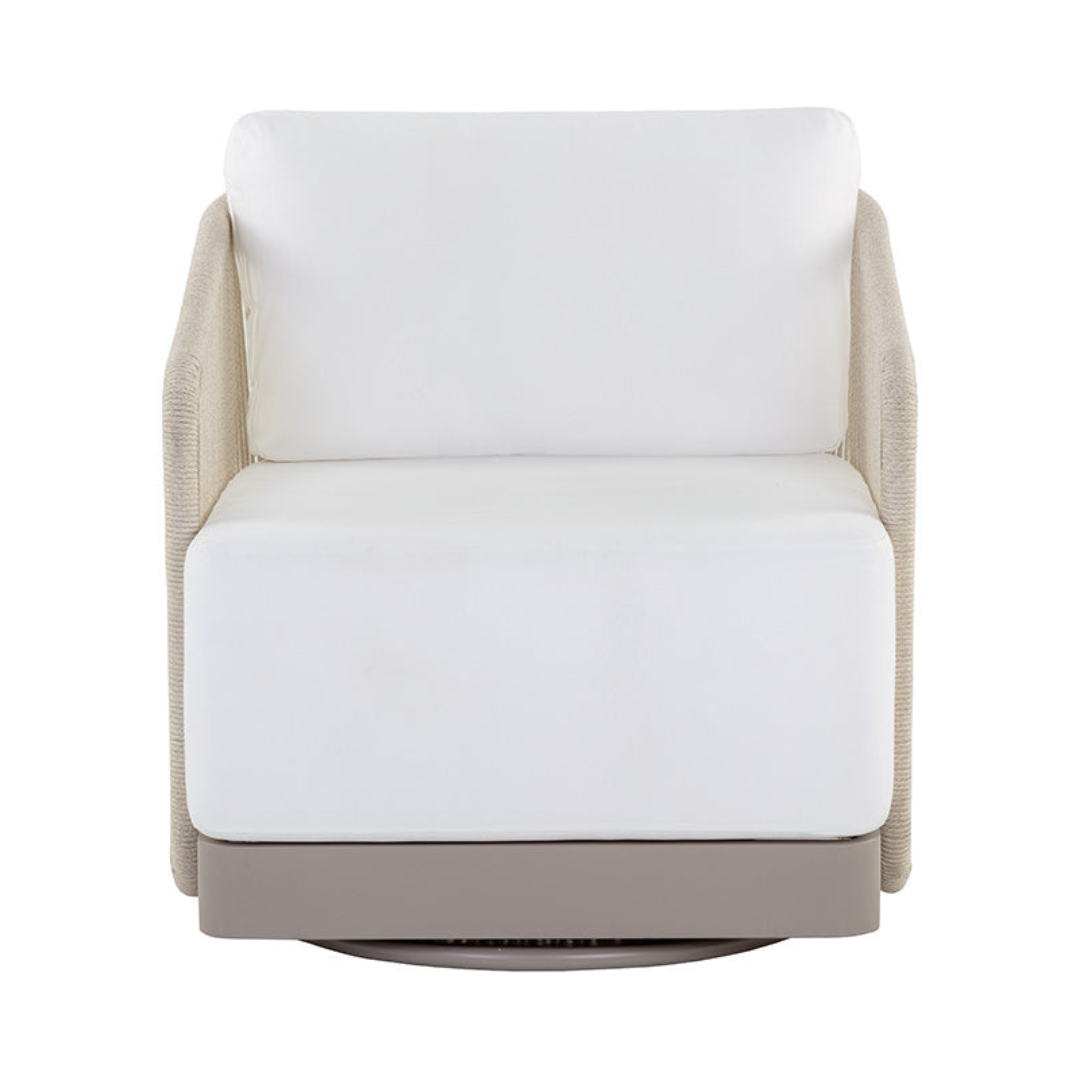 Introduce refined modern style outside with this impressive swivel armchair from the Outdoor by SUNPAN collection. Upholstered in stinston white fabric with a powder-coated greige aluminum frame. Completed with cream rope weaving on the seat exterior.Features & Benefits