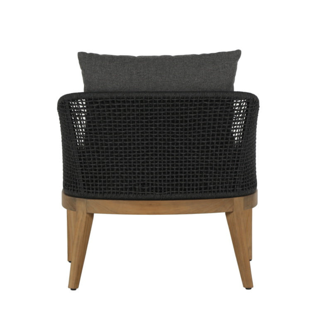 Blur the lines of inside and out with this beautiful outdoor lounge chair. This comfortable design features a barrelback frame wrapped in weave and seat cushions in fabric. A natural teak wood base completes the look. Suitable for indoor and covered outdoor spaces.