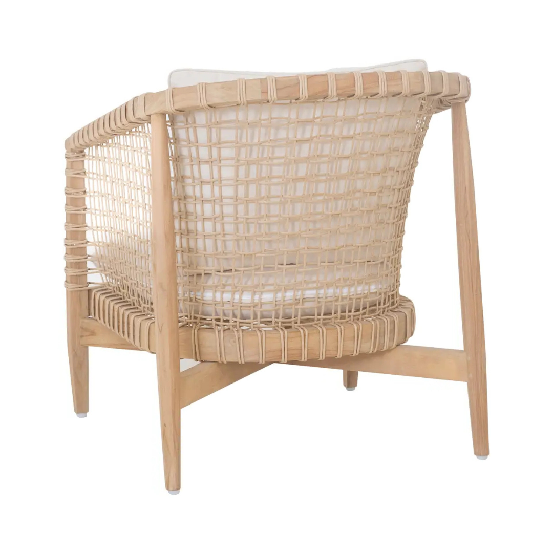 the Jove lounge chair blends traditional Lloyd Loom weaving with a modern solid teak frame. The warm teak will naturally develop a rich patina over time, beautifully contrasted by crisp white, removable cushions. Designed for comfort and durability, Kove is a versatile piece for indoor or outdoor lounging.