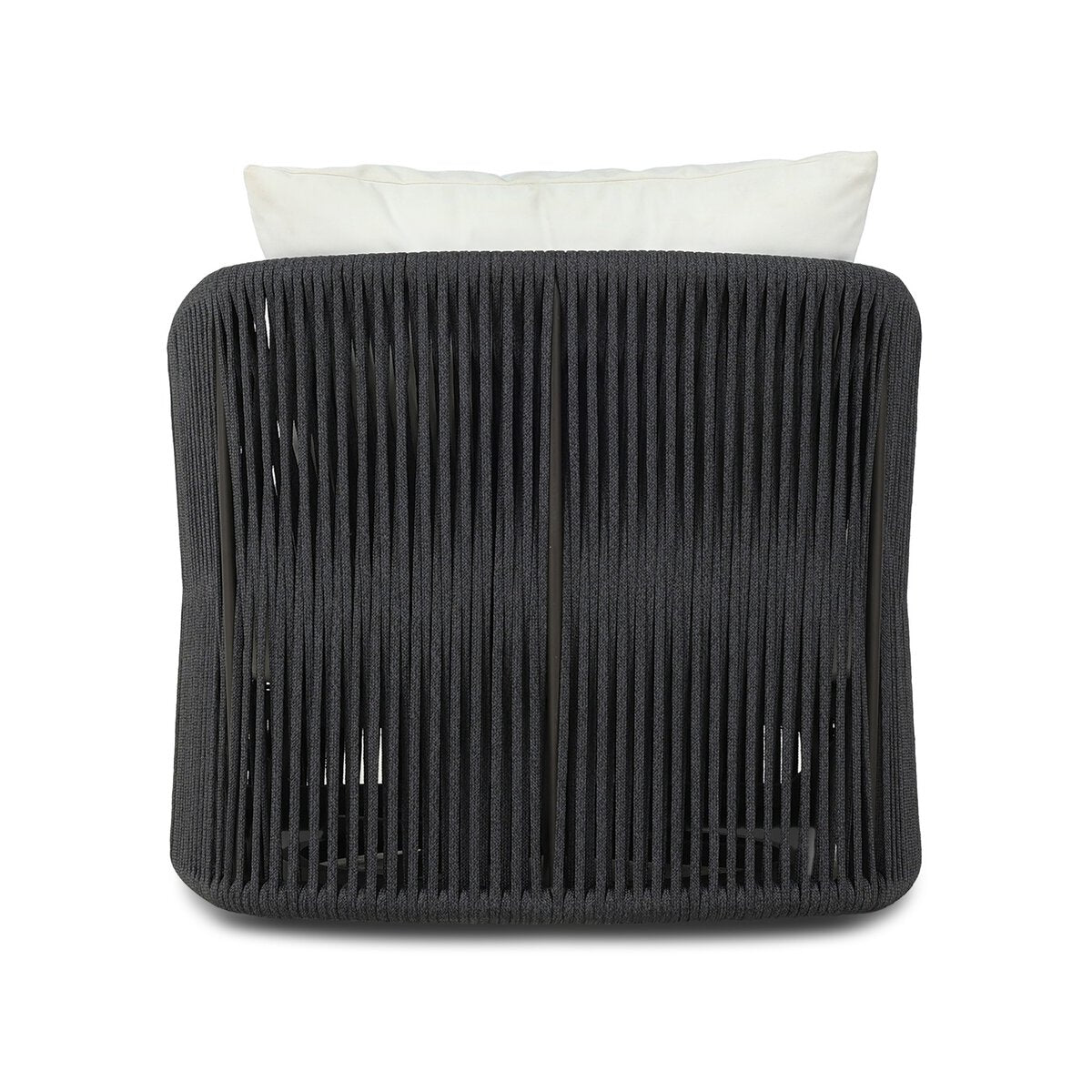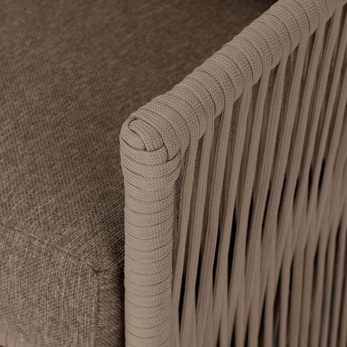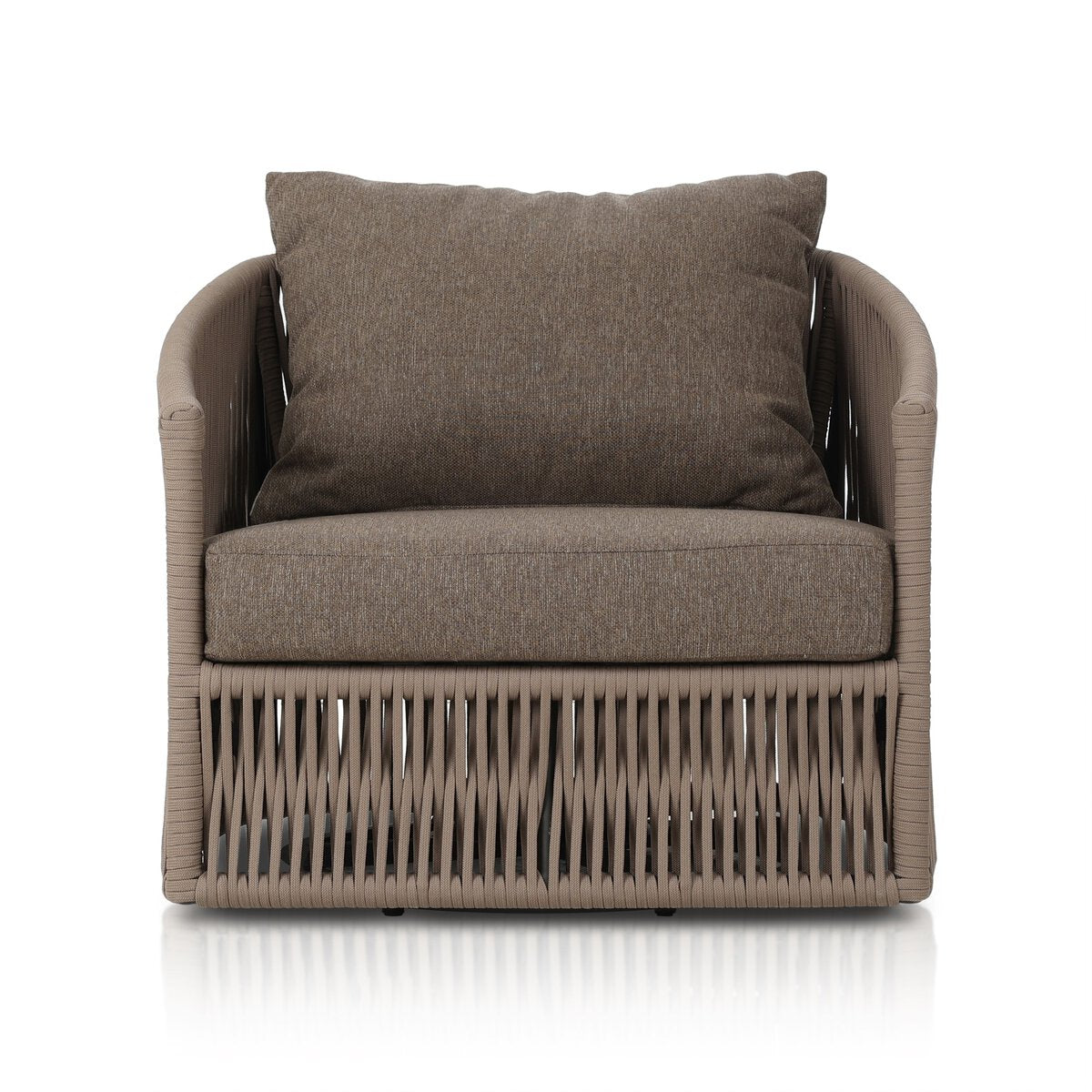 A beautiful rope-based design is woven across a durable, 360-swivel aluminum frame in a rich bronze finish. Topped with a wide cushion and throw pillow, all upholstered in 100% olefin, known for its UV-resistant, water-repellent and quick-drying abilities. Cover or store indoors during inclement weather and when not in use.