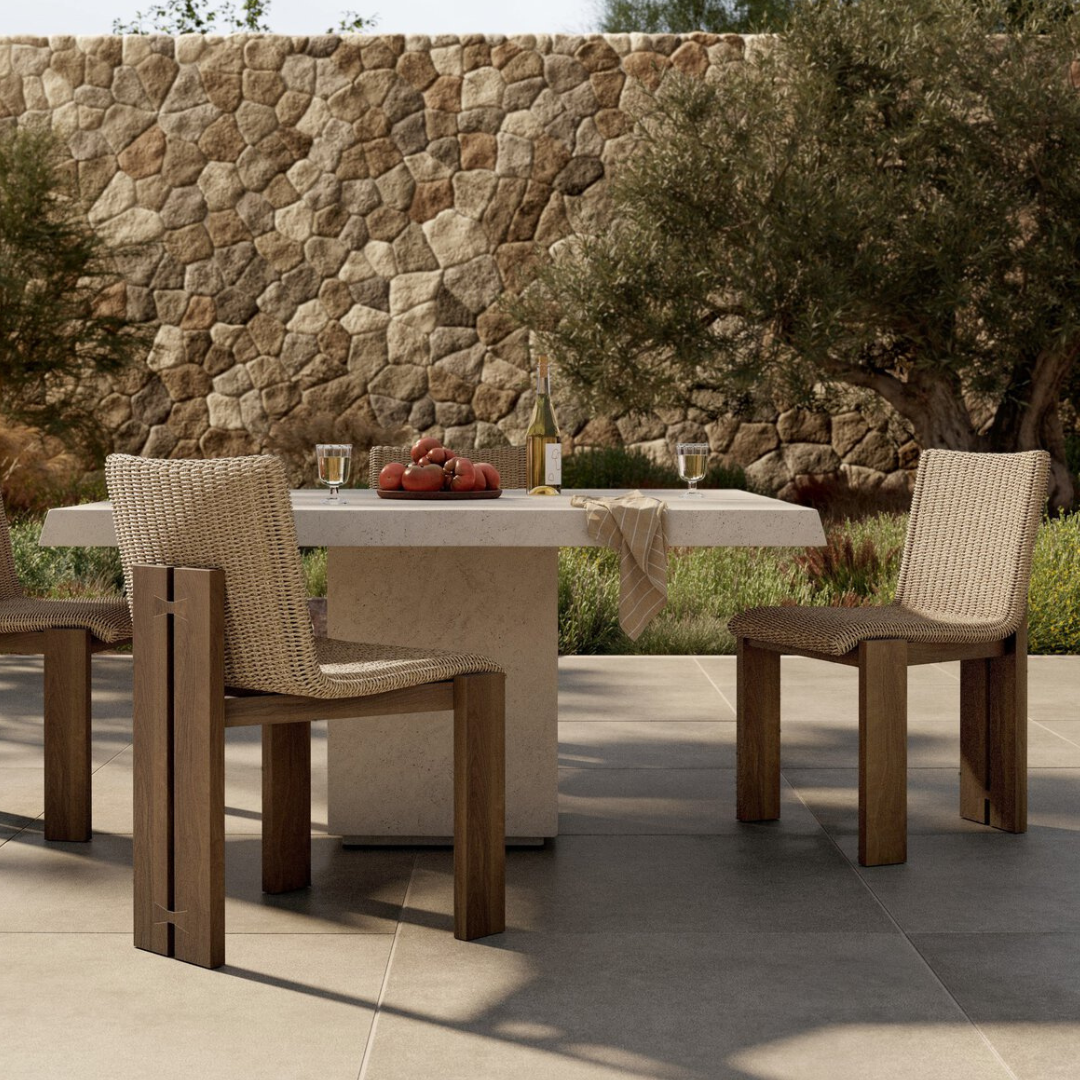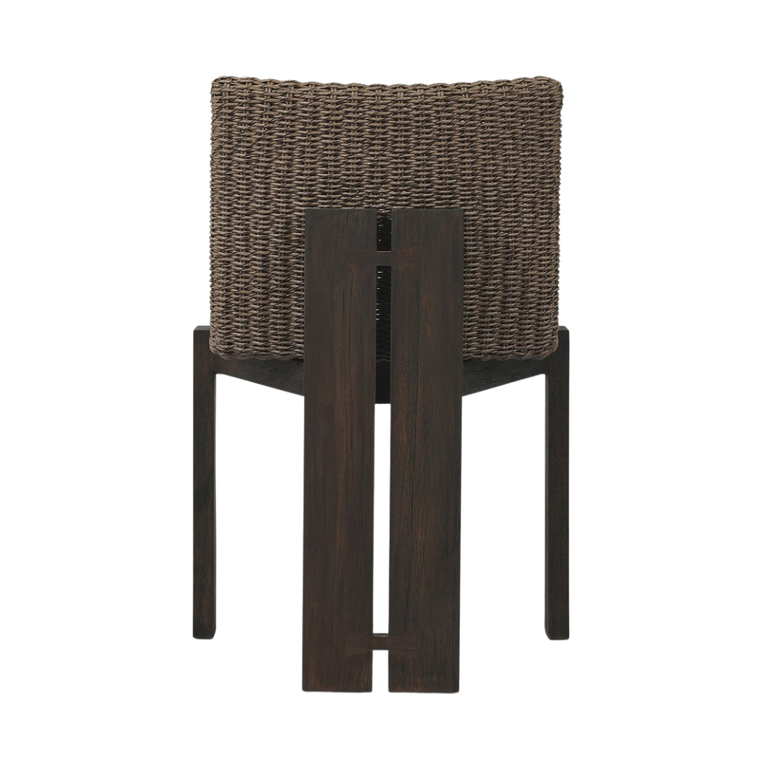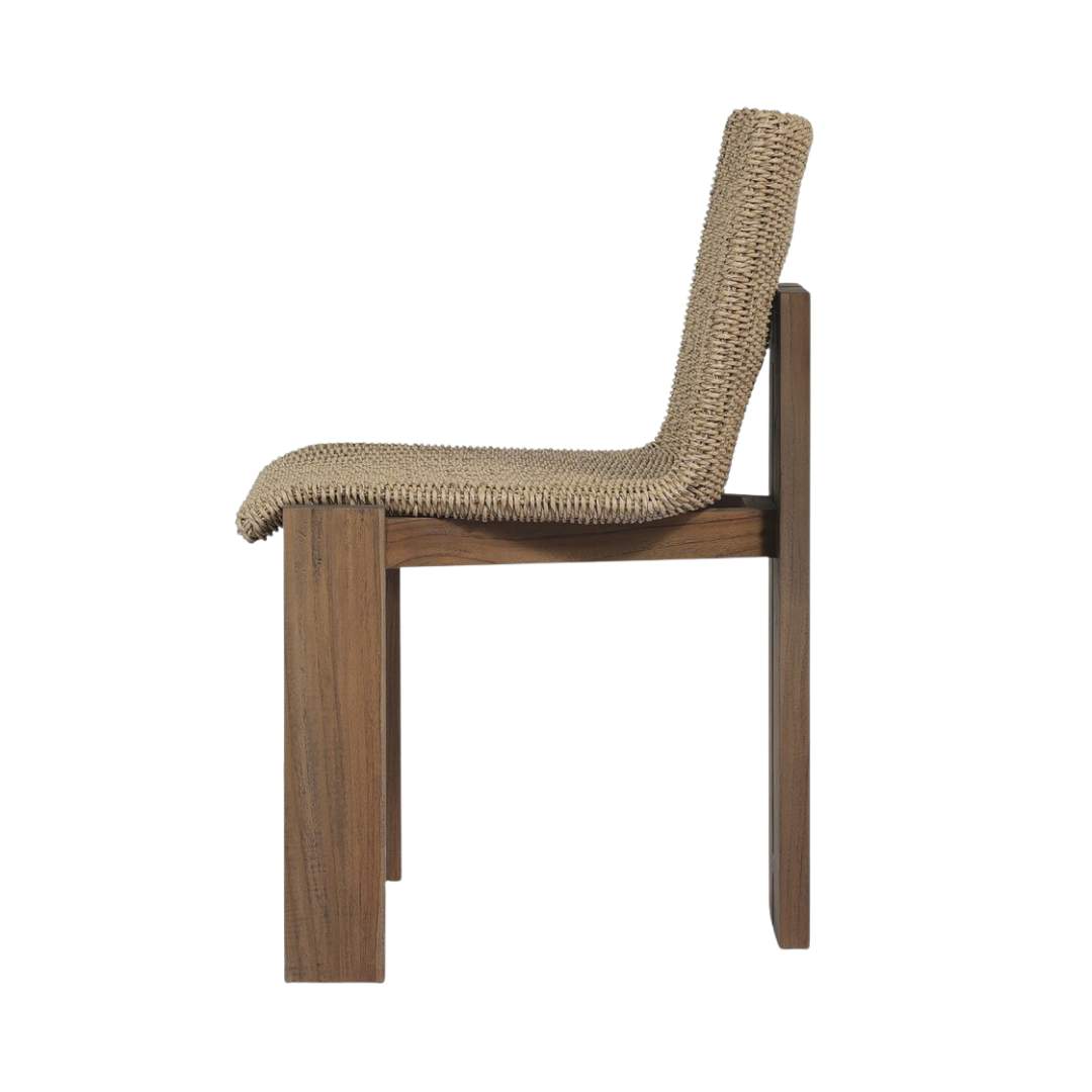 Unique in shape with an angular teak frame, featuring butterfly joints between the back legs and a fully woven faux hyacinth seat. Cover or store inside during inclement weather and when not in use.