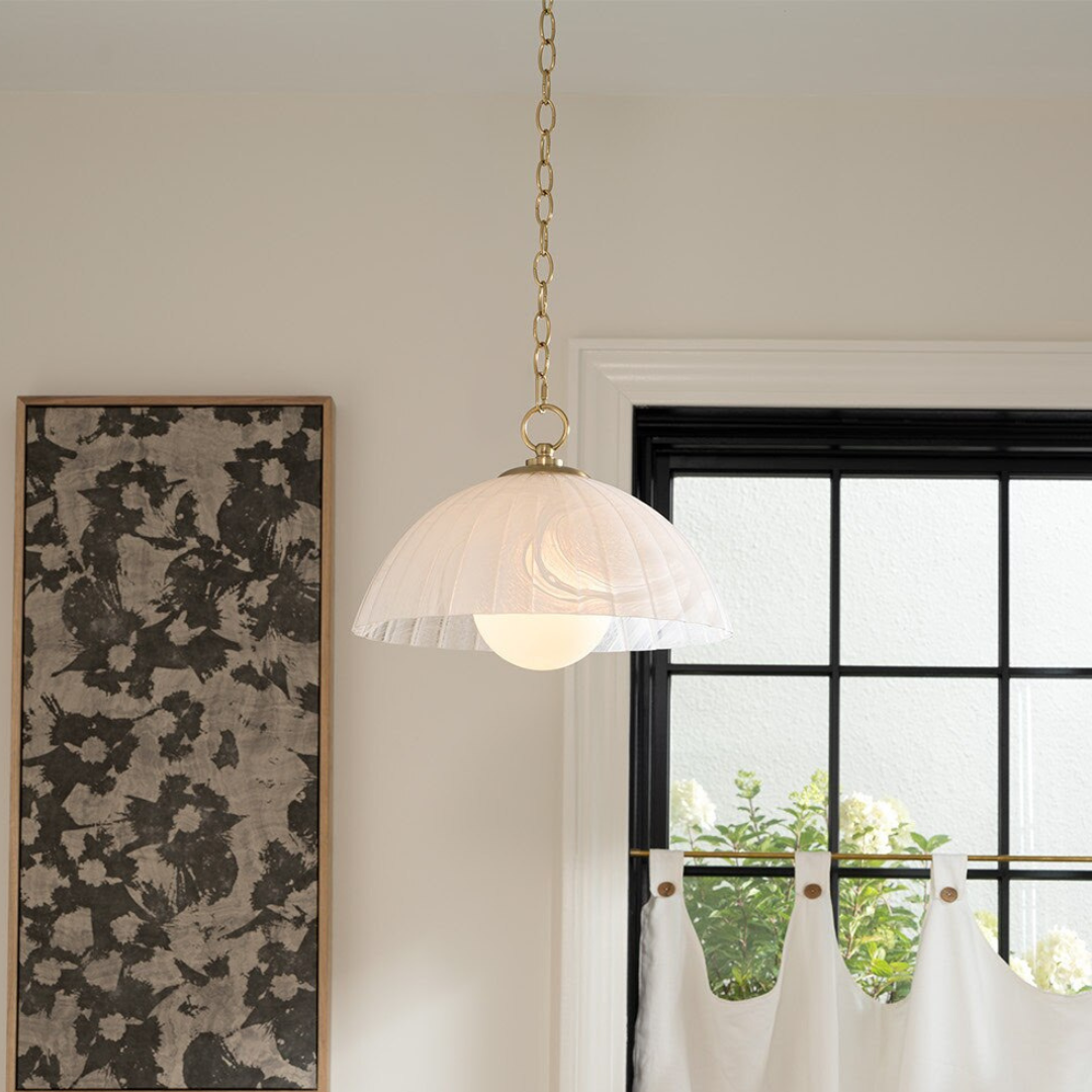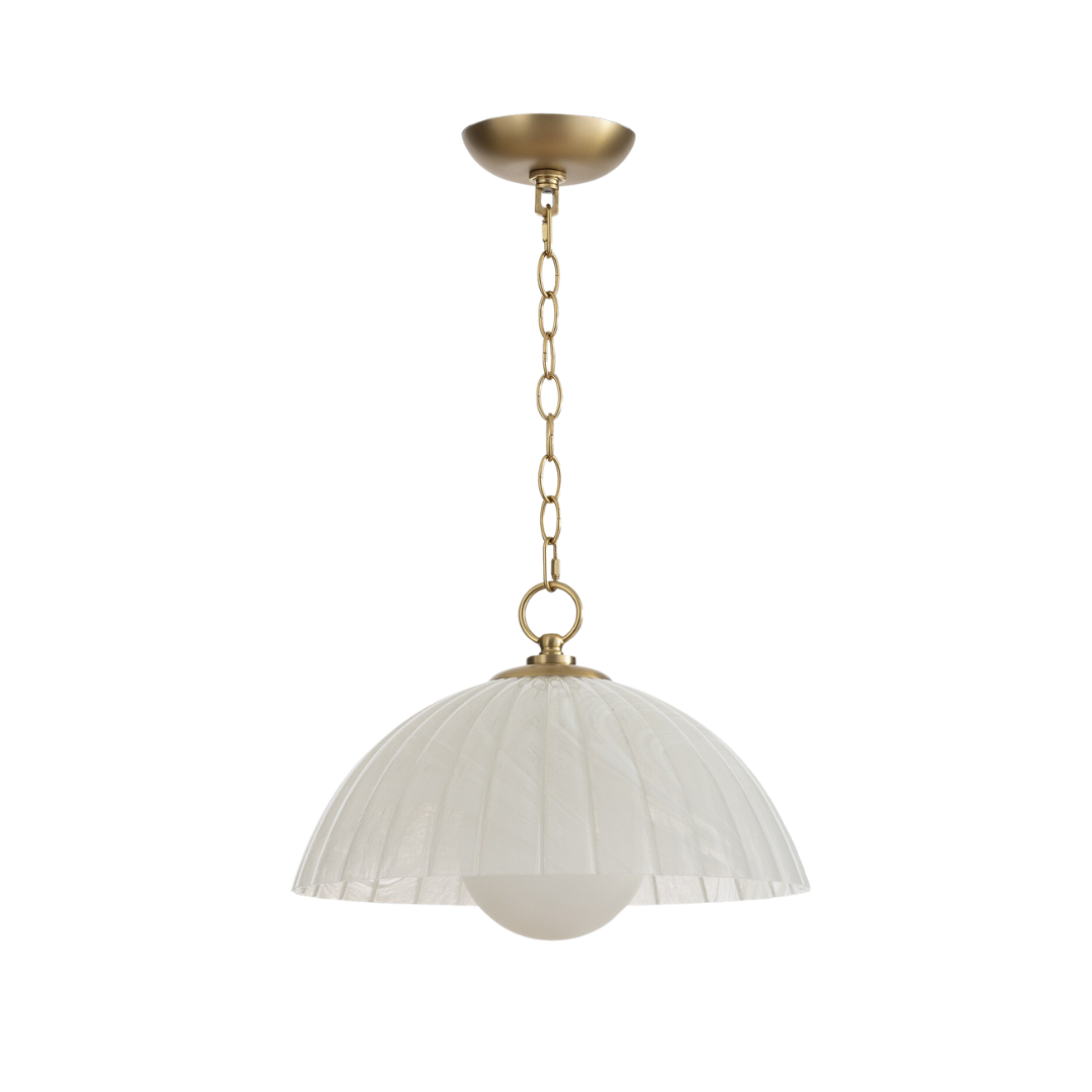 A timeless masterpiece that blends classic elegance with modern sophistication, the Dariel Glass Pendant is a versatile glass dome fixture featuring luxurious natural brass chain and accents. The glass shade has a mesmerizing swirled pattern, adding a touch of intrigue and casting an inviting glow wherever it illuminates.