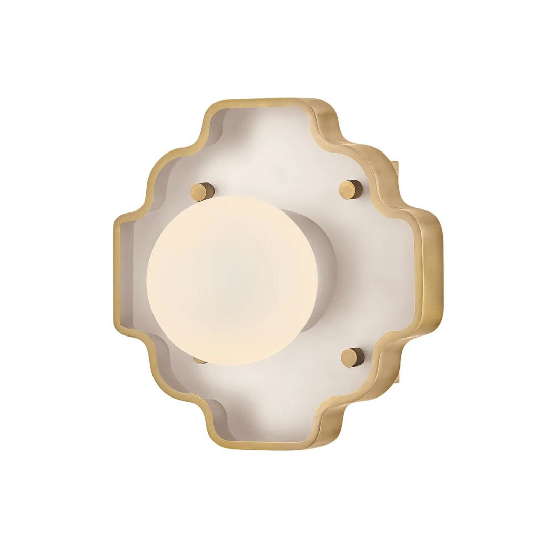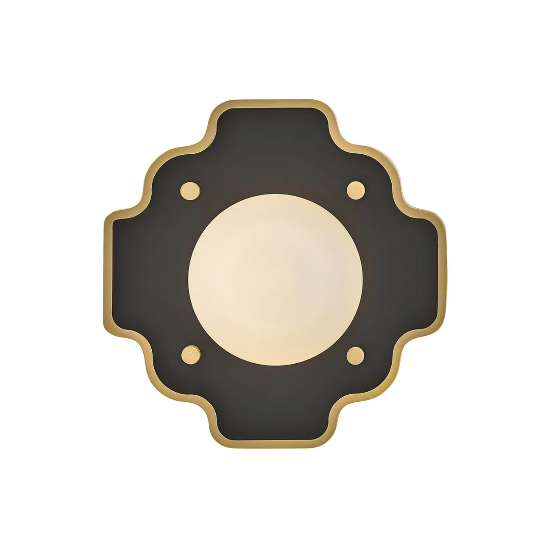 Ideal for cozy nooks or tight areas, Howe is well-constructed with a stunning geometric design, accentuated by its solid inset faceplate and contrasting knobs. Vibrant illumination shines through etched opal glass, enhancing your space with an optimized glow. Howe sconces can be effortlessly mounted on any wall or elegantly hung from the ceiling as a charming mini flush mount. Available in Light Taupe or Gloss Black, both with brass accents