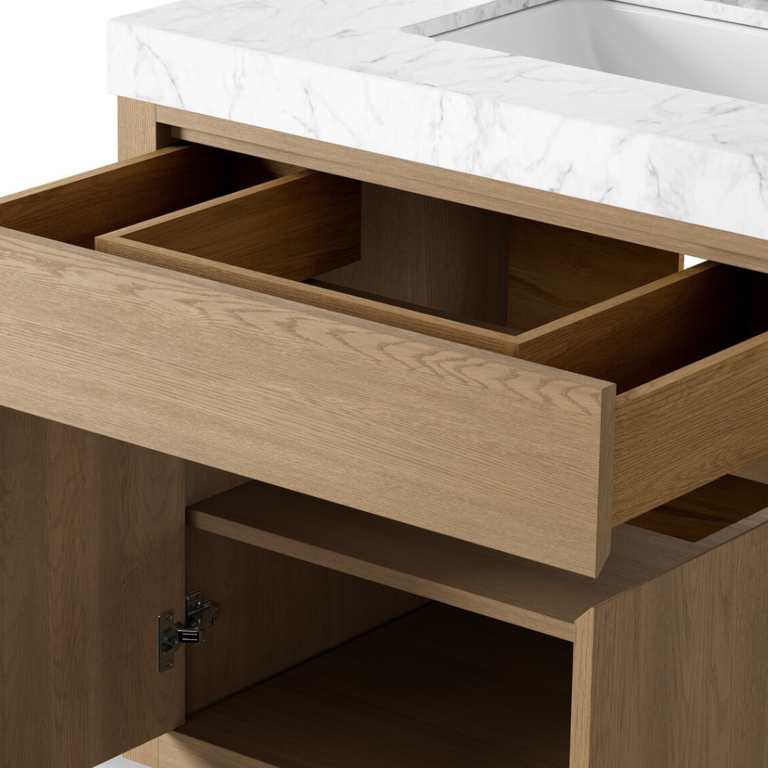 Set up to bring serenity and function, this vanity has it all. Topped with a hefty marble top and an oak base, this versatile piece easily updates both the modern and traditional bathrooms. Finished with a bath-safe sealant for moisture resistance. Designed to accommodate 8-inch widespread faucets and standard-size hardware for easy customization; faucet shown not included. Sink and backsplash included; backsplash ships separately. Removable back with cutouts for plumbing; fits standard P-trap. Professional installation required.