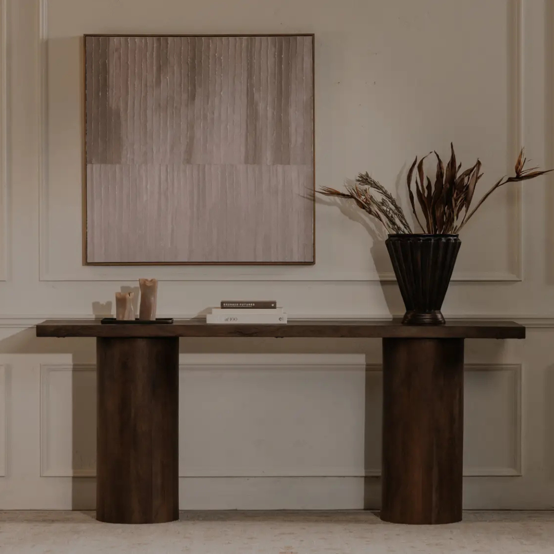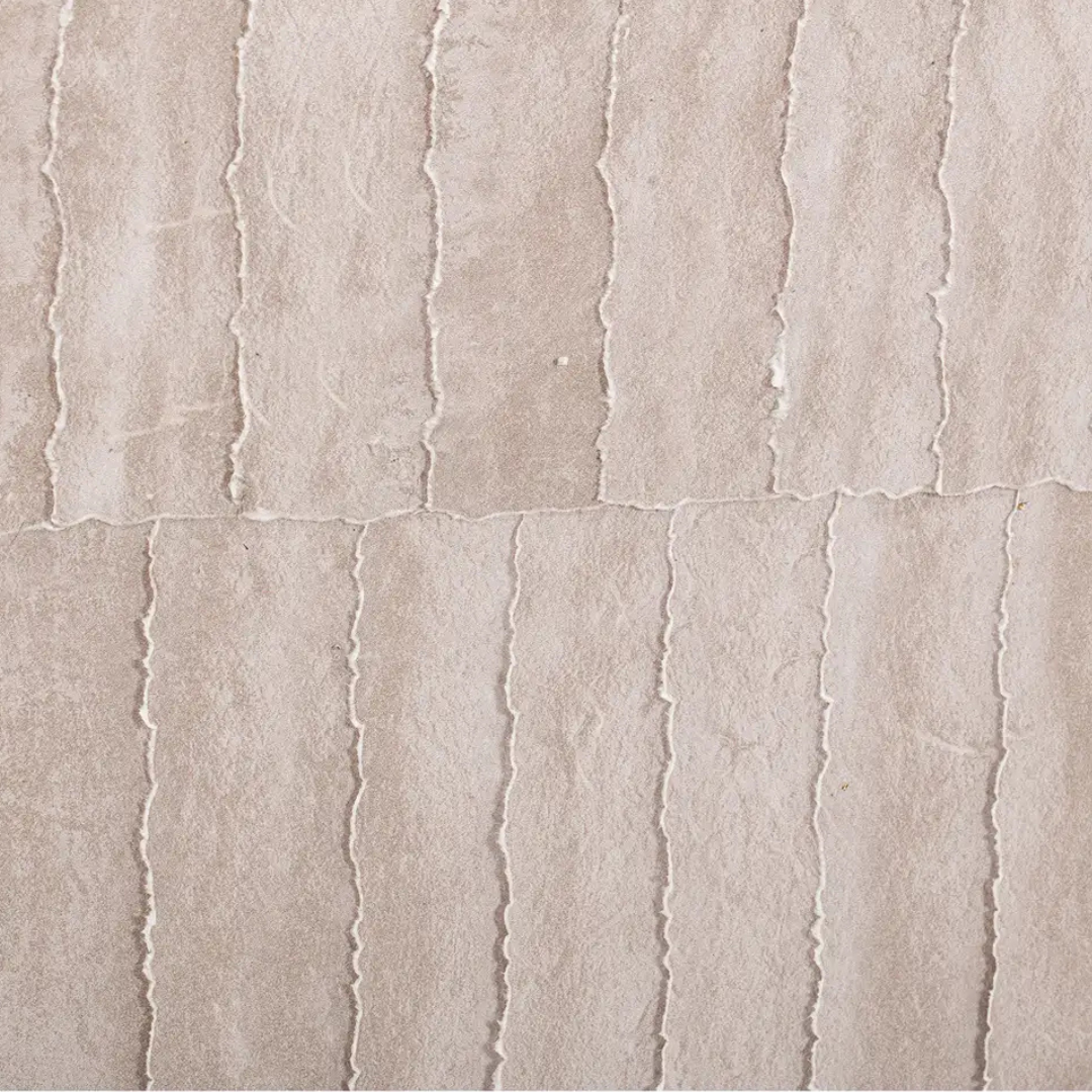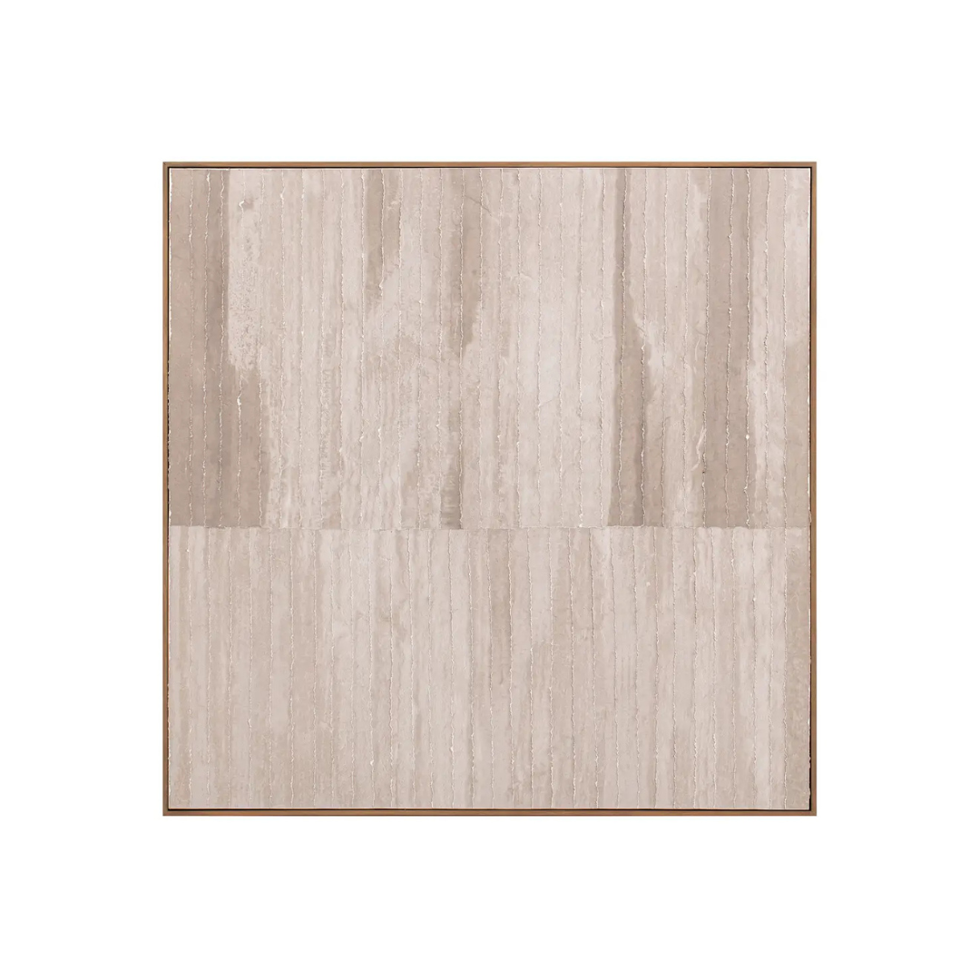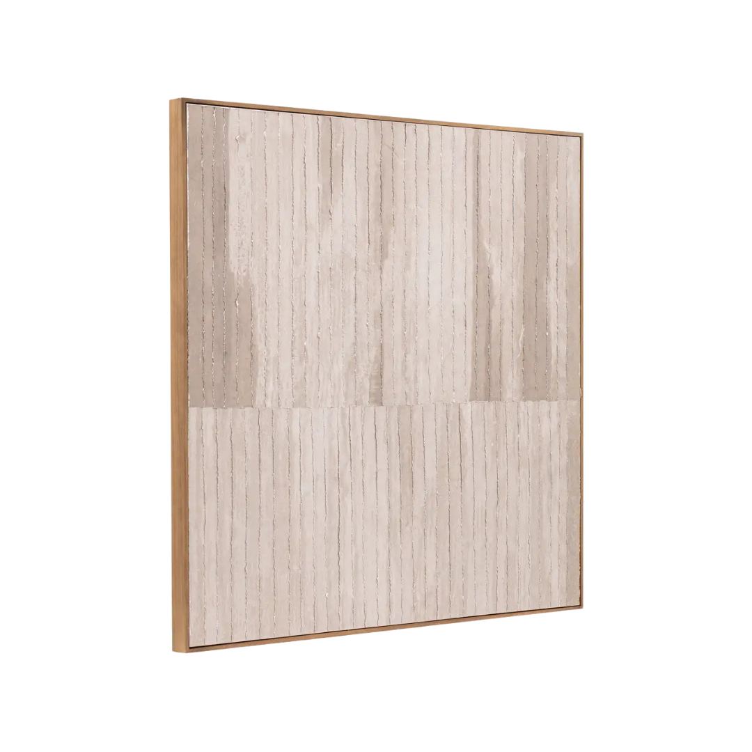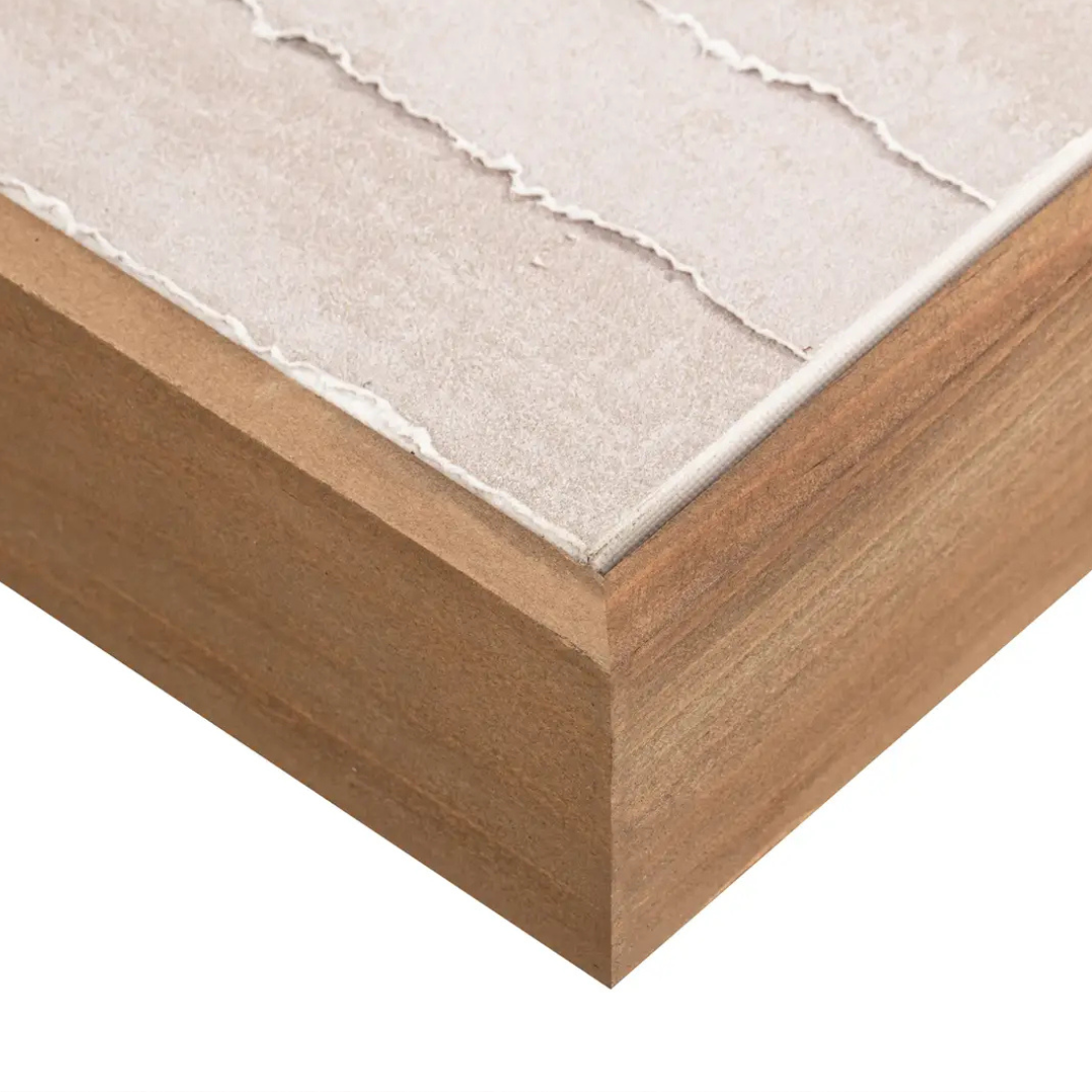 The Welkin features layered torn-paper detailing that creates soft depth and texture in warm, neutral tones. Clean linear forms give it a minimalist, calming feel, while the solid pine frame adds natural warmth. A serene, versatile piece that suits both modern and transitional spaces.